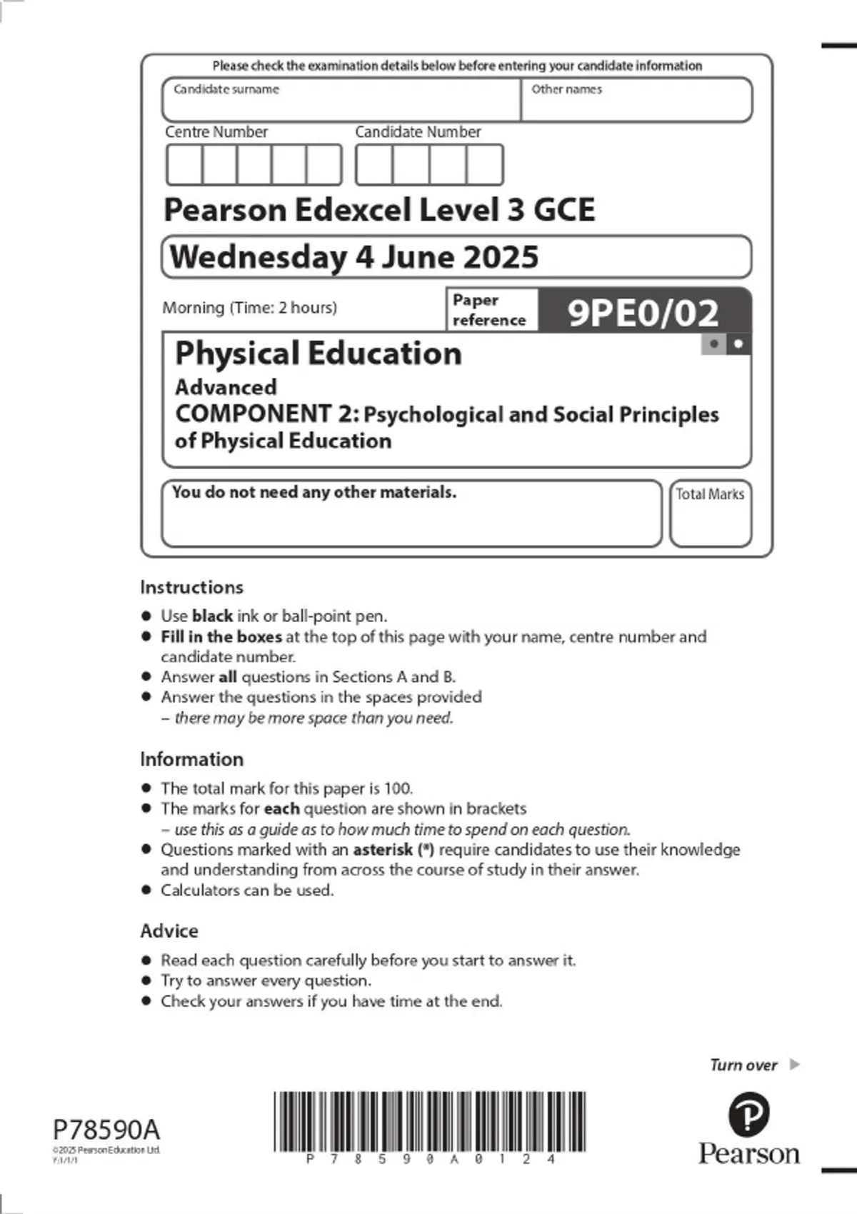 2025 Pearson Edexcel Level 3 GCE 9PE0/02 Physical Education Advanced COMPONENT 2: Psychological and Social Principles of Physical Education QUESTION PAPER & MARKSCHEME (MERGED)