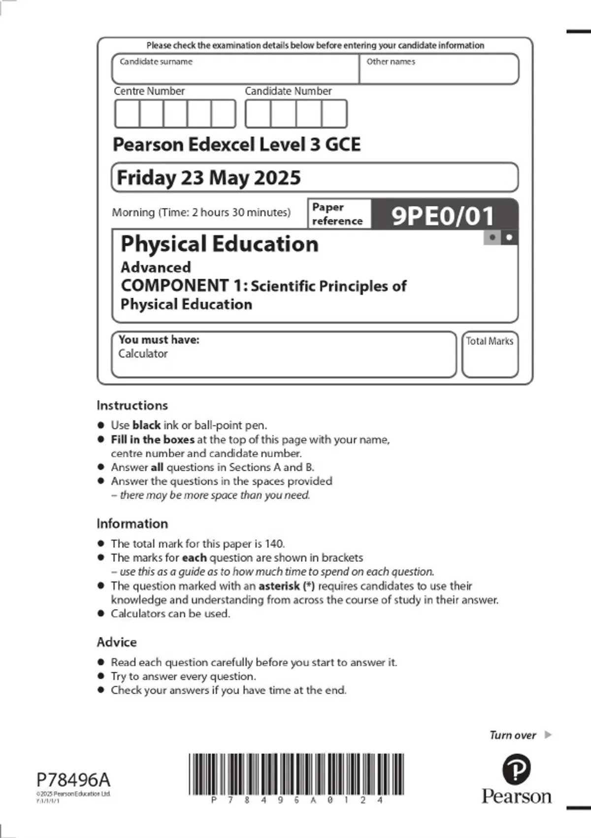 2025 Pearson Edexcel Level 3 GCE 9PE0/01 Physical Education Advanced COMPONENT 1: Scientific Principles of Physical Education QUESTION PAPER & MARKSCHEME (MERGED)