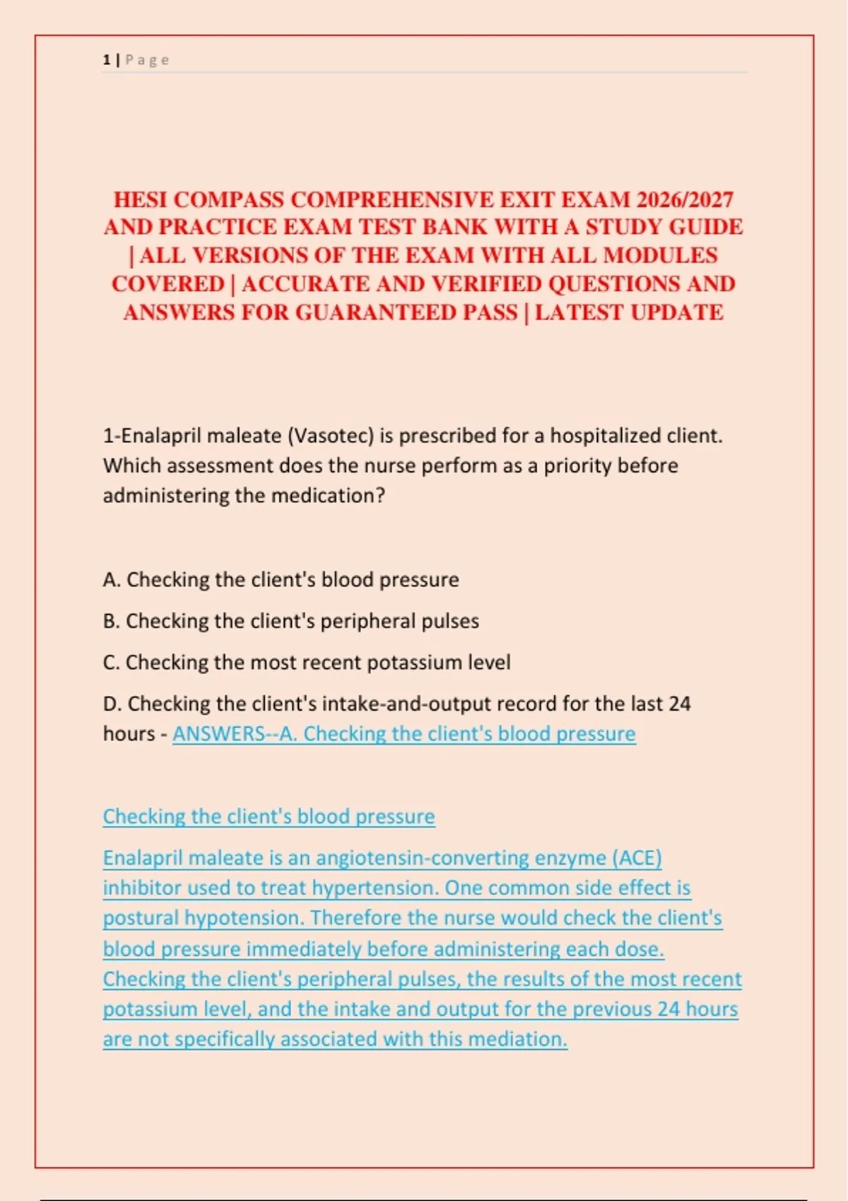 HESI COMPASS COMPREHENSIVE EXIT EXAM 2026/2027