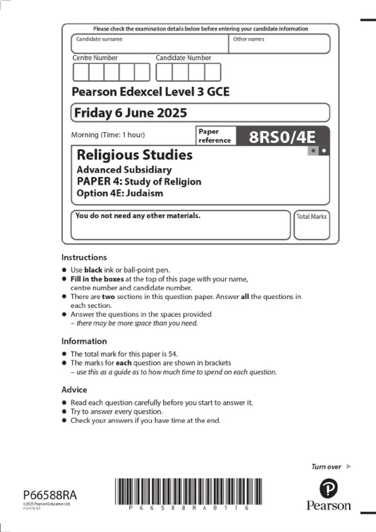 2025 Pearson Edexcel Level 3 GCE 8RS0/4E Religious Studies Advanced Subsidiary PAPER 4: Study of Religion Option 4E: Judaism QUESTION PAPER & MARKSCHEME (MERGED)