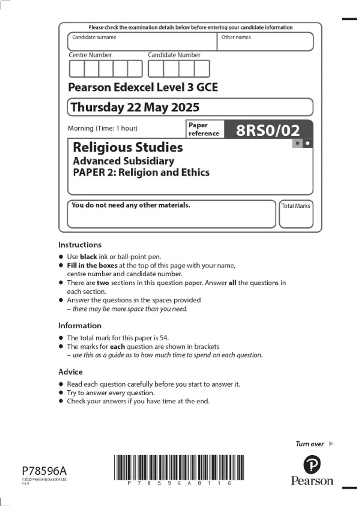 2025 Pearson Edexcel Level 3 GCE 8RS0/02 Religious Studies Advanced Subsidiary PAPER 2: Religion and Ethics QUESTION PAPER & MARKSCHEME (MERGED)