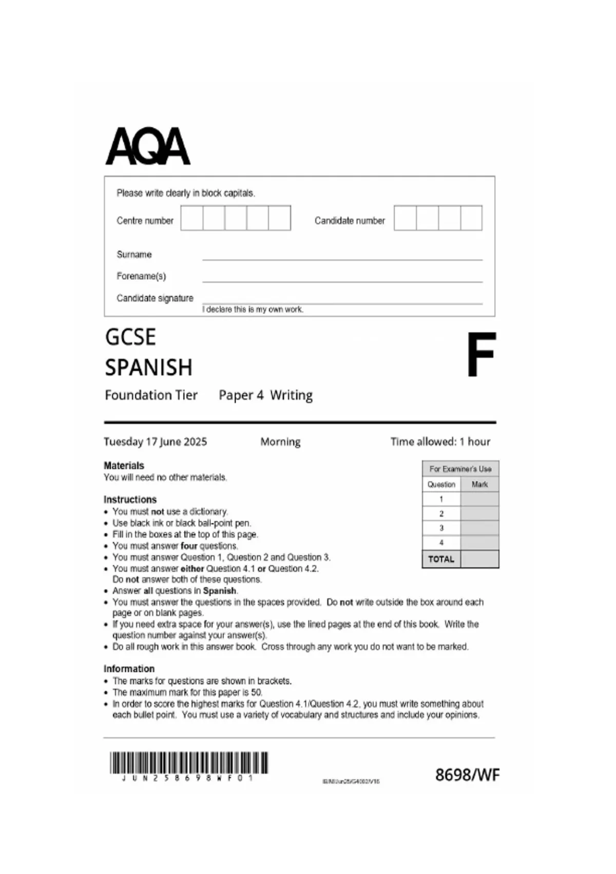 GCSE AQA Spanish Foundation Tier Writing – 2025 Exam merged mark scheme
