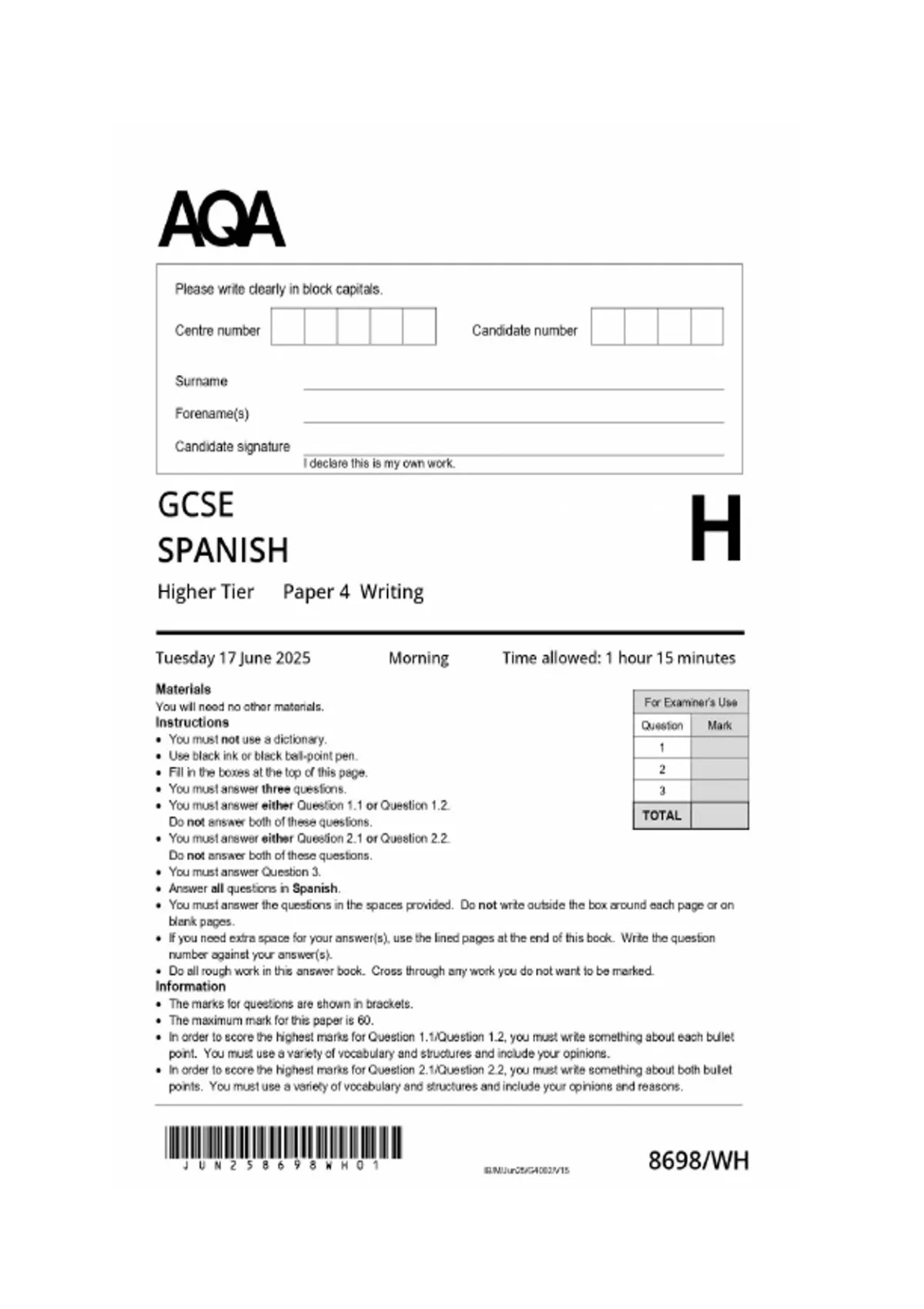 GCSE AQA Spanish Higher Tier Paper 4 Writing – 2025 Exam