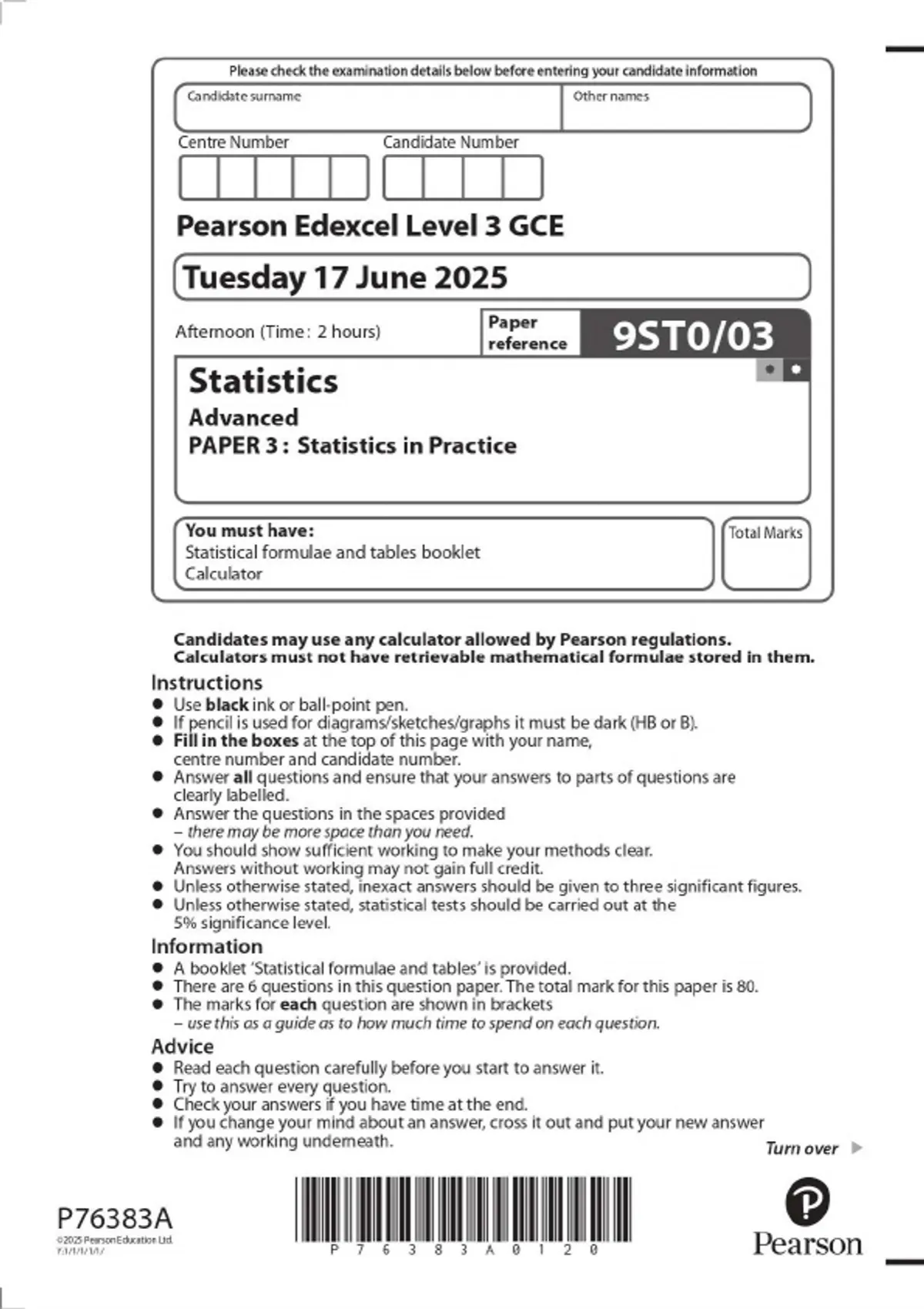 2025 Pearson Edexcel Level 3 GCE 9ST0/03 Statistics Advanced PAPER 3: Statistics in Practice QUESTION PAPER & MARKSCHEME (MERGED)