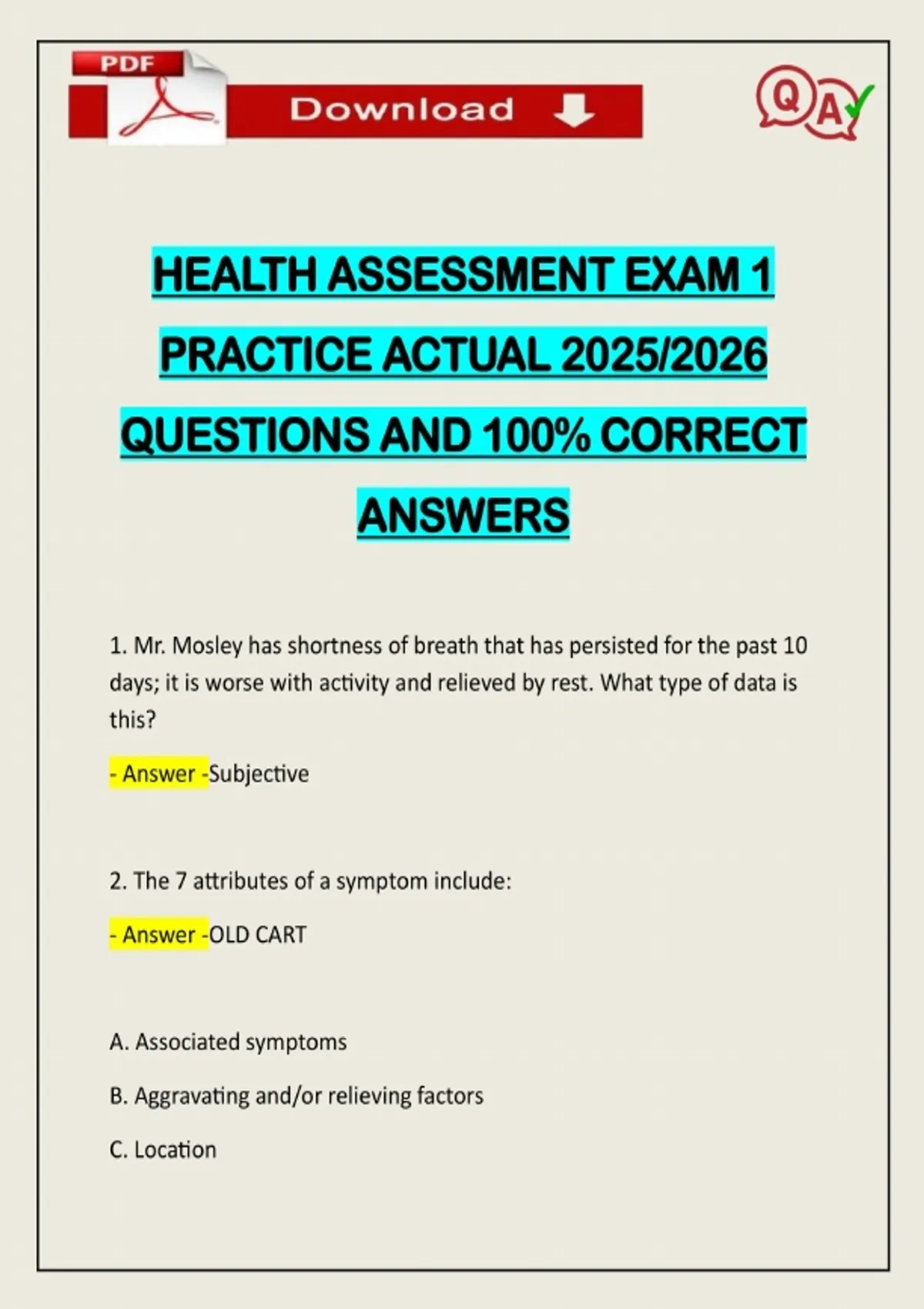 HEALTH ASSESSMENT EXAM 1 PRACTICE ACTUAL 2025/2026 QUESTIONS AND 100% CORRECT ANSWERS 1. Mr. Mosley has shortness of breath that has persisted for the past 10 days; it is worse with activity and relieved by rest. What type of data is this? - Answer -Subjective 2. The 7 attributes of a symptom include: - Answer -OLD CART A. Associated symptoms B. Aggravating and/or relie