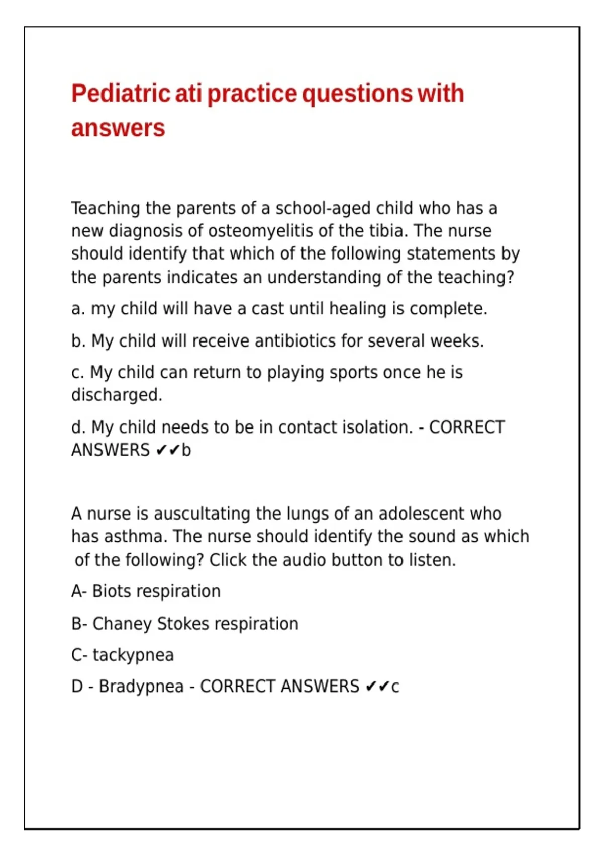 D - Bradypnea - CORRECT ANSWERS ✔✔c