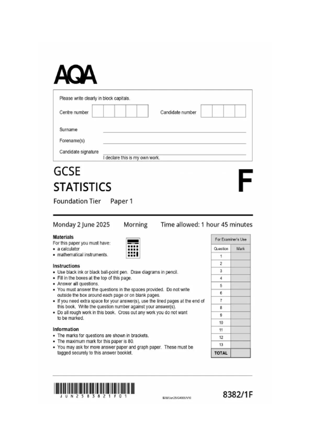 GCSE AQA Statistics Foundation Tier Paper 1 – 2025 Exam