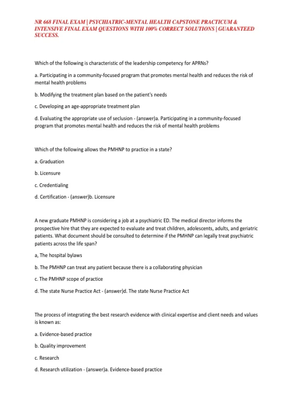 ,NR 668 FINAL EXAM | PSYCHIATRIC-MENTAL HEALTH CAPSTONE PRACTICUM &