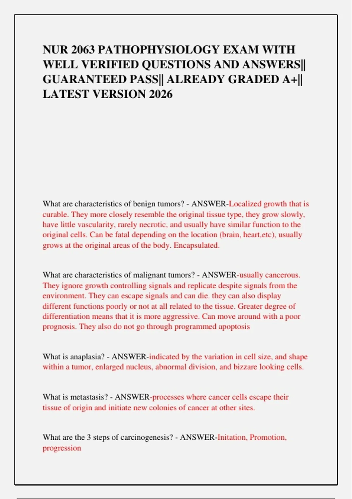NUR 2063 PATHOPHYSIOLOGY EXAM WITH WELL VERIFIED QUESTIONS AND ANSWERS|| GUARANTEED PASS|| ALREADY GRADED A+|| LATEST VERSION 2026 What are characteristics of benign tumors? - ANSWER-Localized growth that is curable. They more closely resemble the original tissue type, they grow slowly, have little vascularity, rarely necrotic, and usually have similar function to the original cells. Can be fatal depending on the location (brain, heart,etc), usually grows at the original areas of the body. Encapsulated. What are characteristics of malignant tumors? - ANSWER-usually cancerous. They ignore growth controlling signals and replicate despite signals from the environment. They can escape signals and can die. they can also display different functions poorly or not at all related to the tissue. Greater degree of differentiation means that it is more aggressive. Can move around with a poor prognosis. They also do not go through programmed apoptosis What is anaplasia? - ANSWER-indicated by the variation in cell size, and shape within a tumor, enlarged nucleus, abnormal division, and bizzare looking cells. What is metastasis? - ANSWER-processes where cancer cells escape their tissue of origin and initiate new colonies of cancer at other sites. What are the 3 steps of carcinogenesis? - ANSWER-Initation, Promotion, progression Explain initiation stage - ANSWER-events which result in changes to chromosomes or DNA. Initiators include radiation, UV or carcinogens. Explain promotion stage - ANSWER-stage during which mutated cells proliferate. Hormones ensure progression. Explain progression stage - ANSWER-the mutated cells start to exhibit malignant behaviors and permanent changes. What are effects of cancer? - ANSWER-depends on the location of it and the extent of degree of metastasis. Can be asymptomatic in early stages. Increases in size can contribute to aggression. Can cause lots of PAIN Explain cachexia - ANSWER-overall weight loss and generalized weakness due to loss of appetite, increased metabolic rate, nausea and vomiting, Explain anemia - ANSWER-deficiency in circulating red blood cells due to bone marrow suppression. Explain leukopenia - ANSWER-deficiency in circulating white blood cells. Make people more prone to infection. Explain thrombocytopenia - ANSWER-deficiency in circulating platelets. Cannot clot! Cannot bleed out as not clotting! No shaving or contact sports. What are warts (verrucae) - ANSWER-Common benign papillomas caused by DNA papillomaviruses. Skin is thick. What is herpes simplex virus? - ANSWER-begins with a burning or tingling sensation followed by vesicles and erythema that crusts before healing What is the difference between primary and secondary endocrine disorders? - ANSWER-Primary endocrine disease inhibits the action of downstream glands, malfunction of the hormone producing gland; Secondary endocrine disease is indicative of a problem with the pituitary gland.