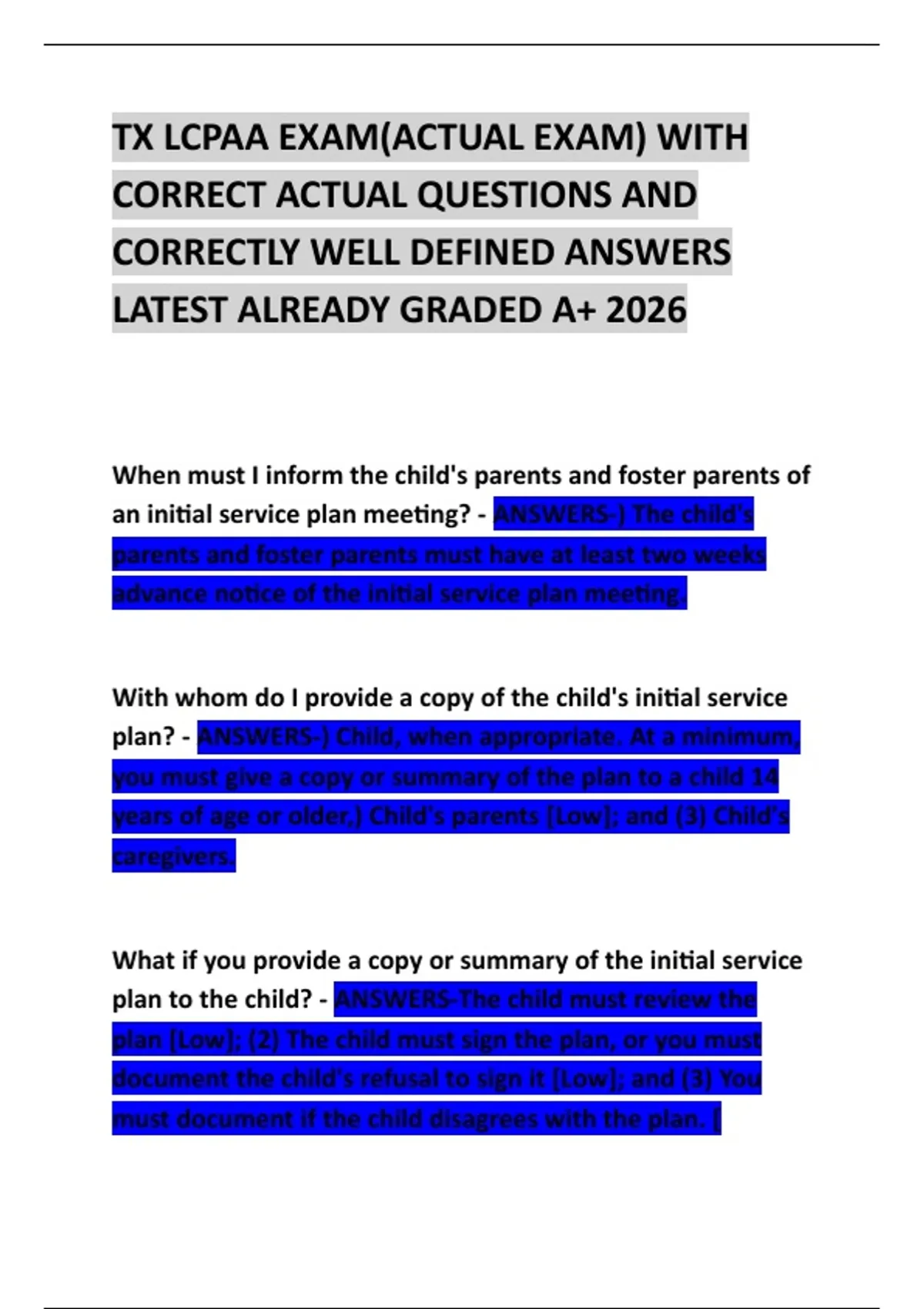 TX LCPAA EXAM(ACTUAL EXAM) WITH CORRECT ACTUAL QUESTIONS AND CORRECTLY WELL DEFINED ANSWERS LATEST ALREADY GRADED A+ 2026