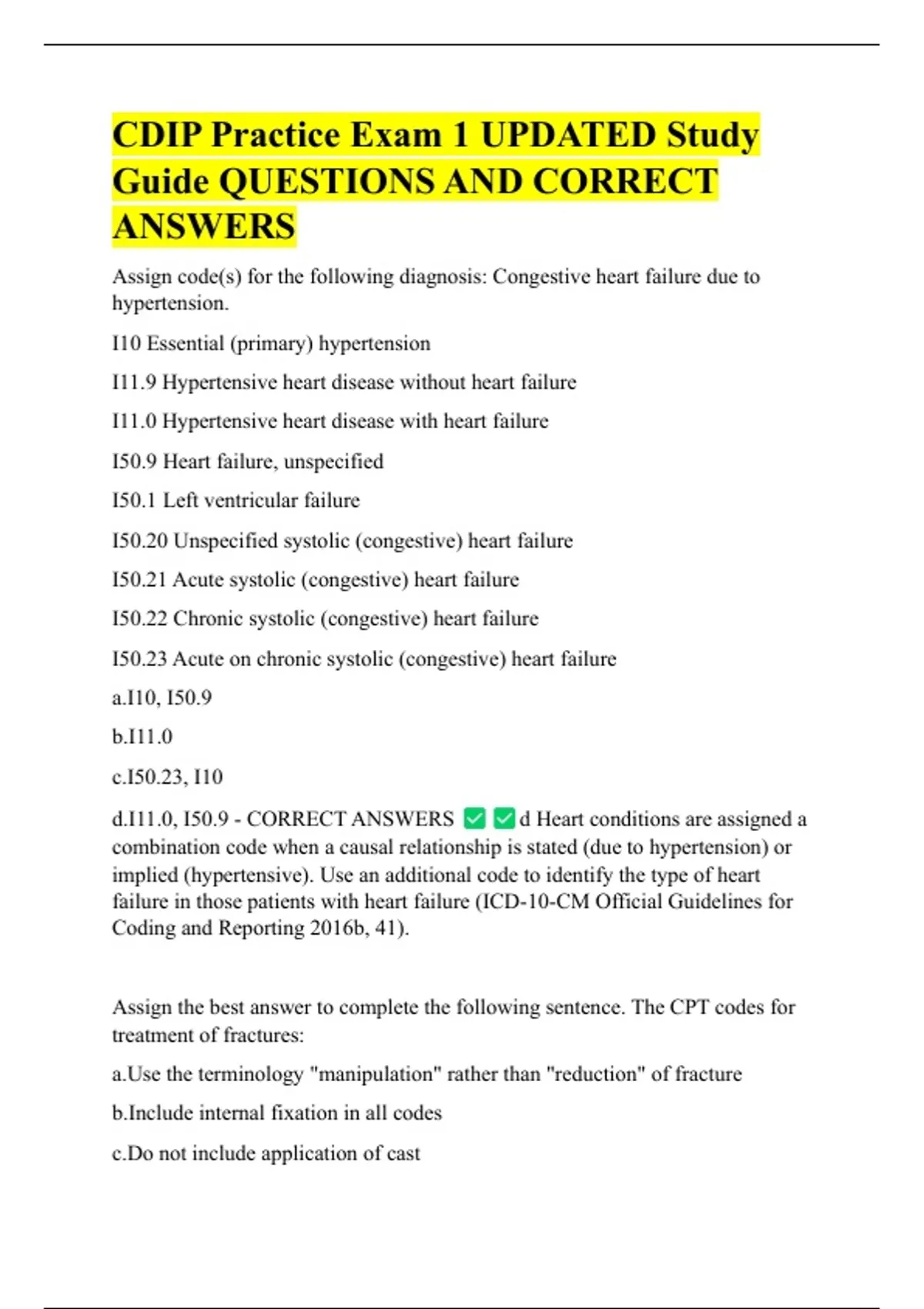 CDIP Practice Exam 1 UPDATED Study Guide QUESTIONS AND CORRECT ANSWERS Assign code(s) for the following diagnosis: Congestive heart failure due to hypertension. I10 Essential (primary) hypertension I11.9 Hypertensive heart disease without heart failure
