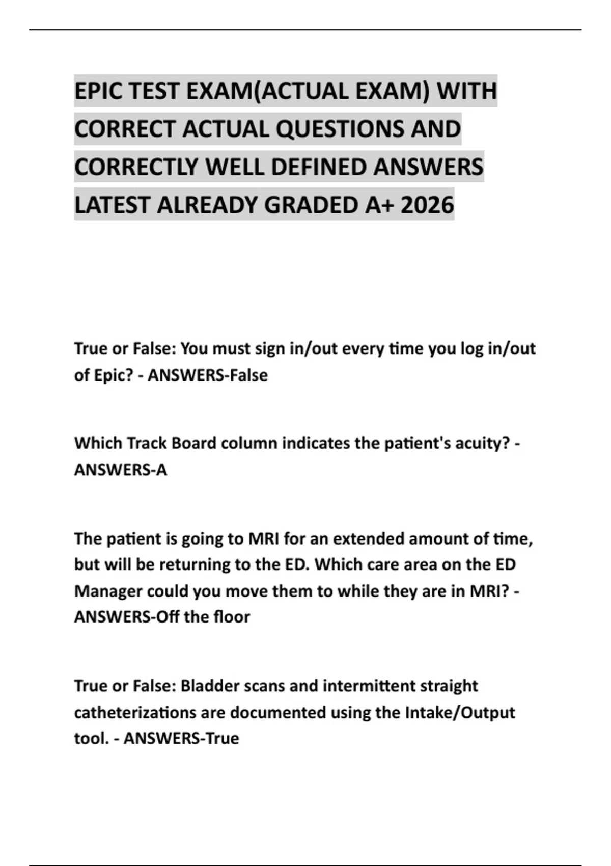 EPIC TEST EXAM(ACTUAL EXAM) WITH CORRECT ACTUAL QUESTIONS AND CORRECTLY WELL DEFINED ANSWERS LATEST ALREADY GRADED A+ 2026