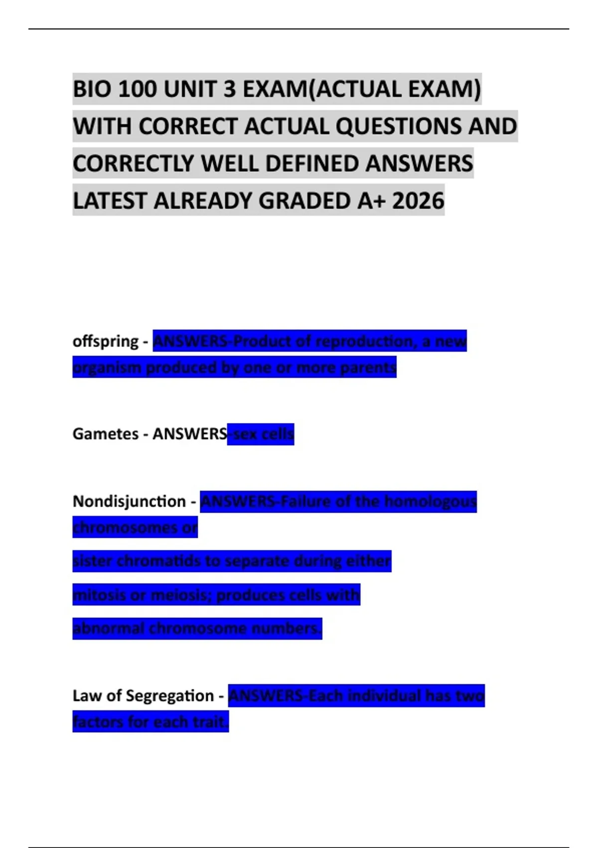 BIO 100 UNIT 3 EXAM(ACTUAL EXAM) WITH CORRECT ACTUAL QUESTIONS AND CORRECTLY WELL DEFINED ANSWERS LATEST ALREADY GRADED A+ 2026