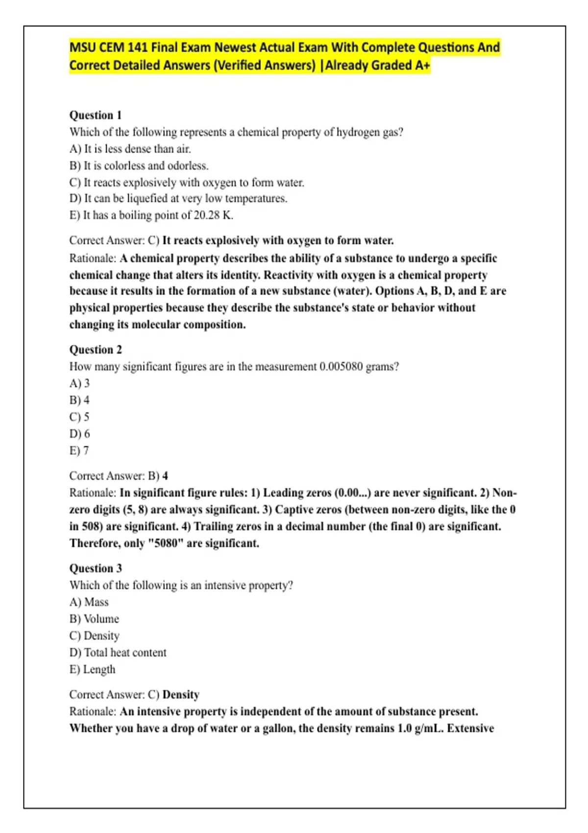MSU CEM 141 Final Exam Newest Actual Exam With Complete Questions And