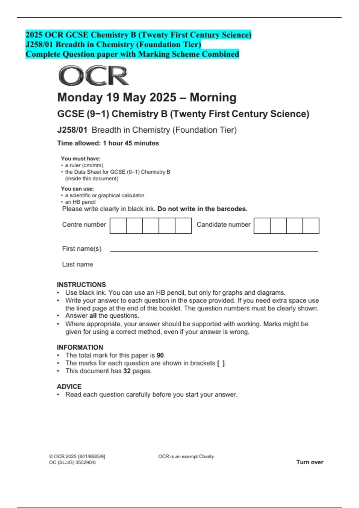 2025 OCR GCSE Chemistry B (Twenty First Century Science)