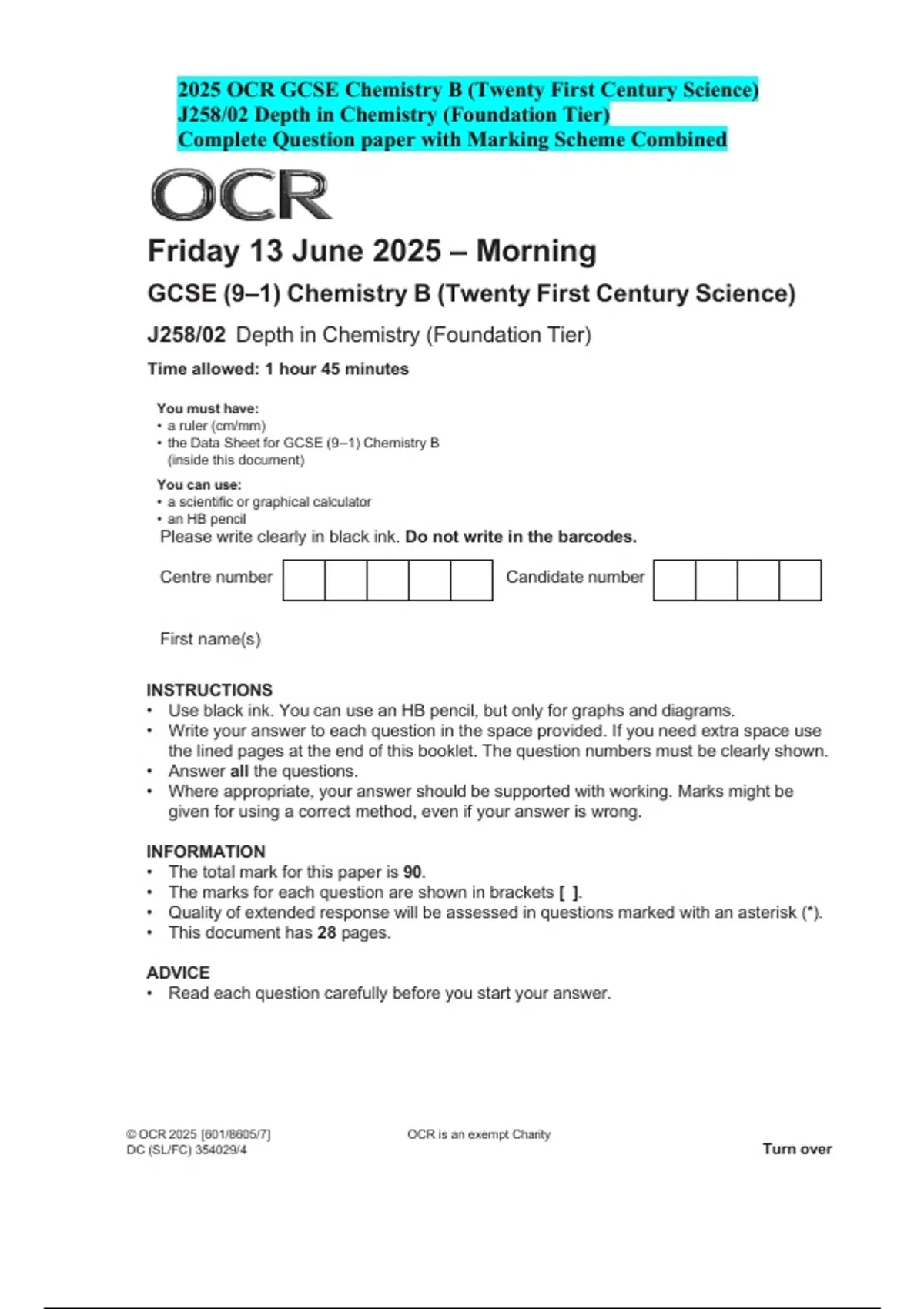 2025 OCR GCSE Chemistry B – J258/02 Depth in Chemistry Foundation Tier Complete Question Paper with Official Mark Scheme Complete 2025 OCR GCSE Chemistry B Foundation Tier resource with official question paper, examiner marking scheme, and fully worked s