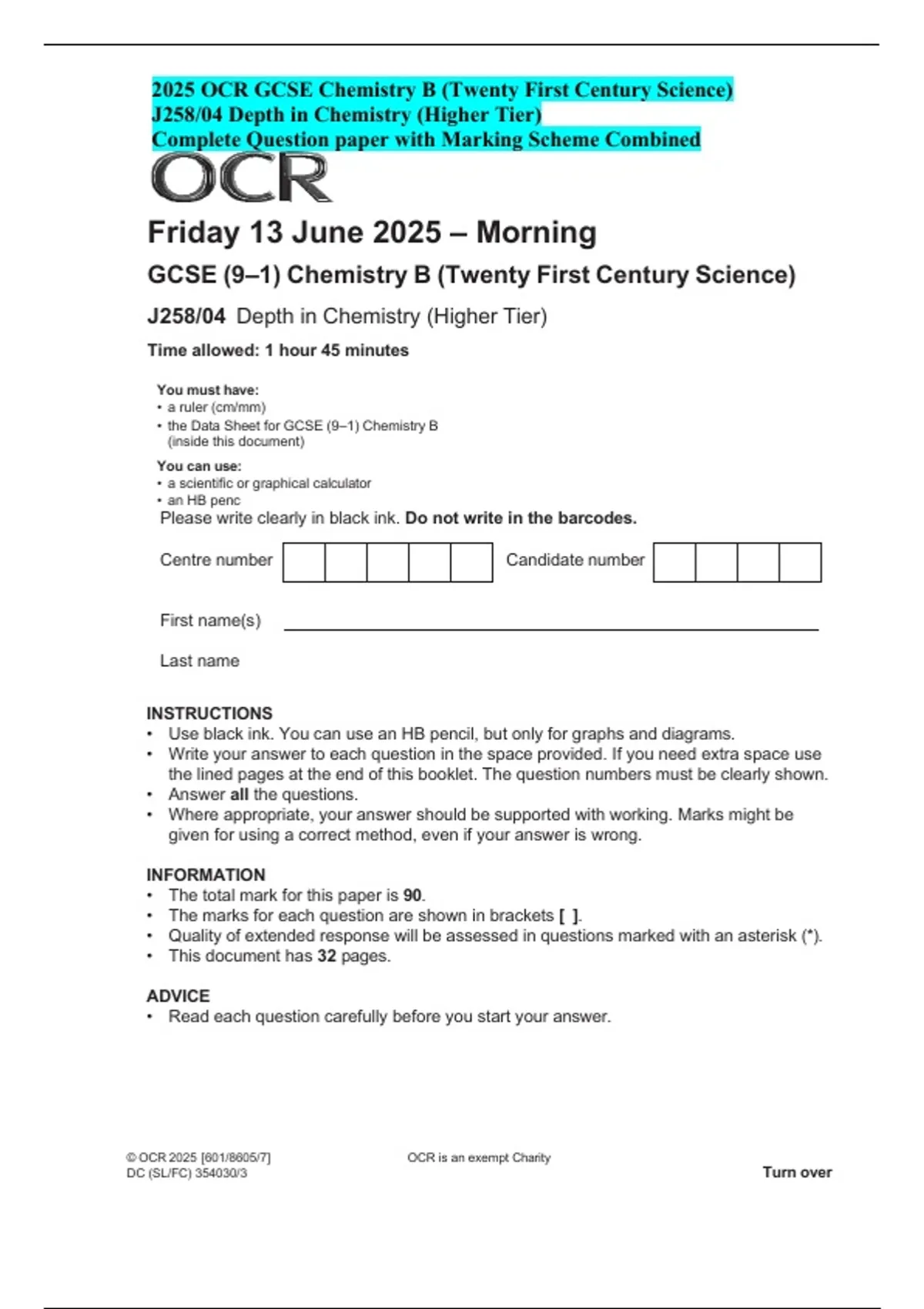 2025 OCR GCSE Chemistry B – J258/04 Depth in Chemistry Higher Tier Complete Question Paper with Official Mark Scheme Complete 2025 OCR GCSE Chemistry B Higher Tier resource with official question paper, examiner marking scheme, and fully worked solutions