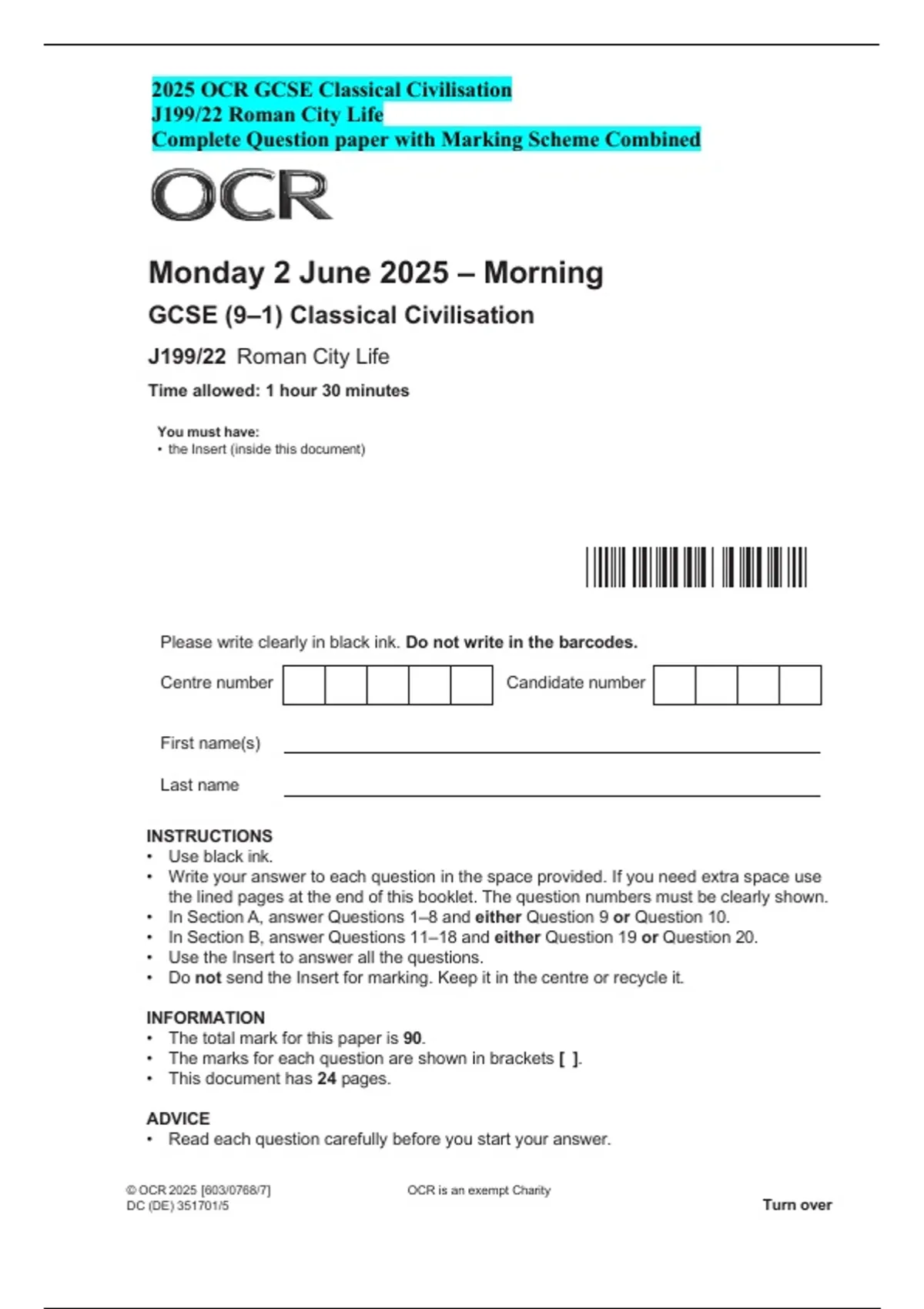 OCR GCSE Classical Civilisation 2025 J199/22 Question Paper Mark Scheme 2025 OCR GCSE Classical Civilisation – J199/22 Roman City Life Complete Question Paper with Official Mark Scheme Complete 2025 OCR GCSE Classical Civilisation resource with official