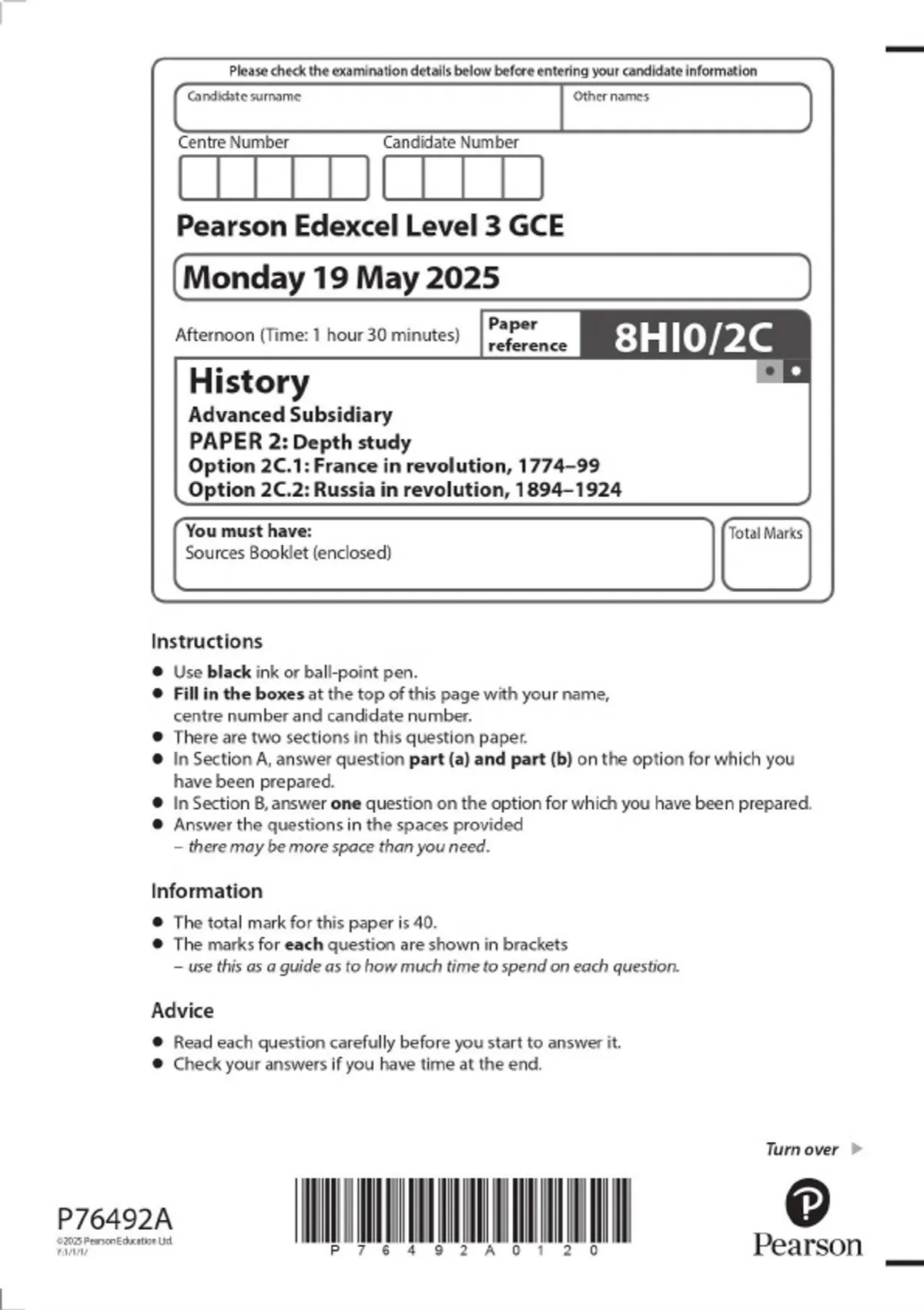 2025 Pearson Edexcel Level 3 GCE 8HI0/2C History Advanced Subsidiary PAPER 2: Depth study Option 2C.1: France in revolution, 1774–99 Option 2C.2: Russia in revolution, 1894–1924 QUESTION PAPER + MARKSCHEME