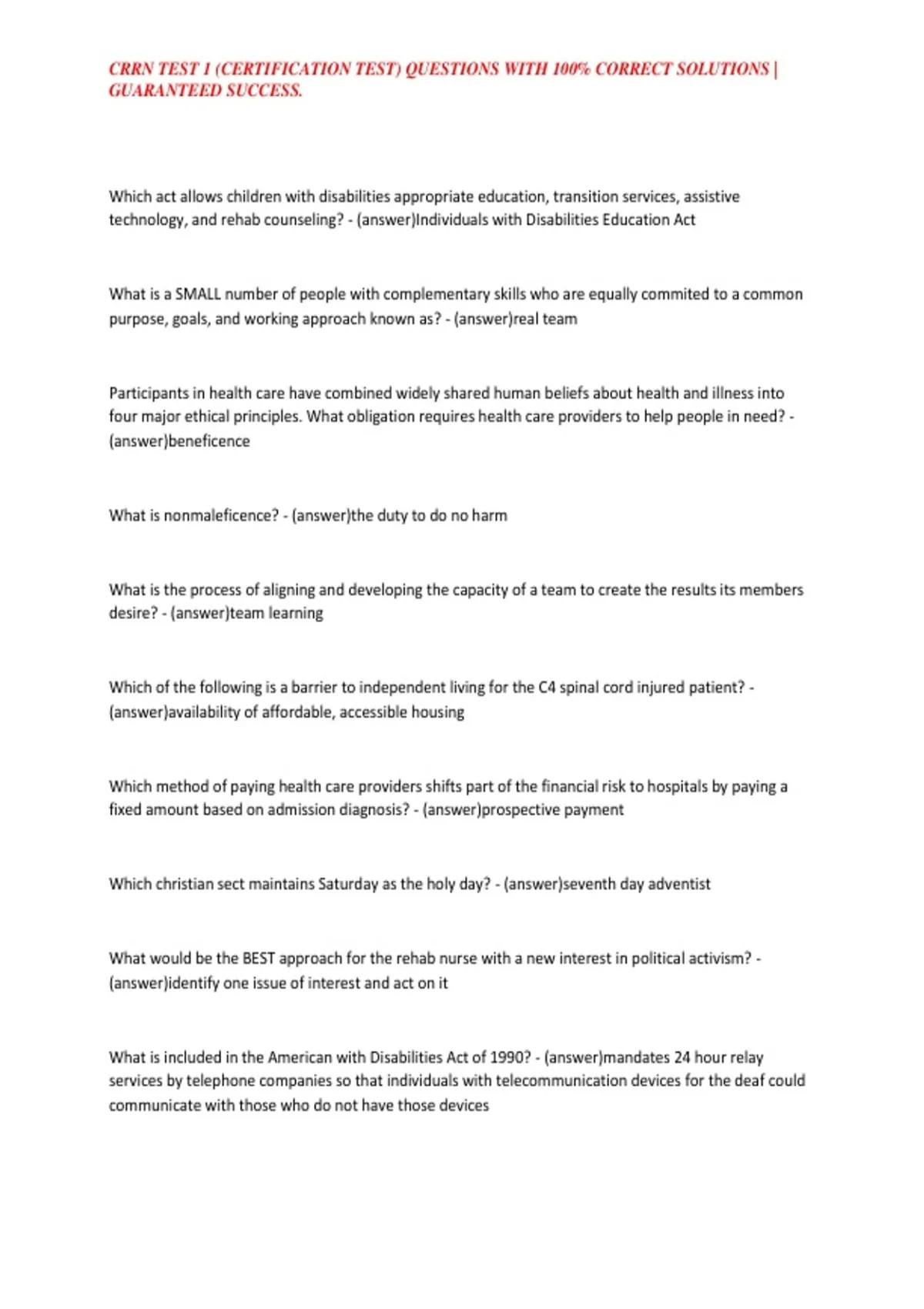CRRN TEST 1 (CERTIFICATION TEST) QUESTIONS WITH 100% CORRECT SOLUTIONS |