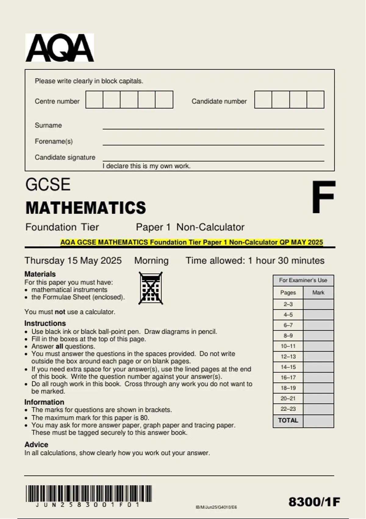 AQA GCSE MATHEMATICS Foundation Tier Paper 1 Non-Calculator QP MAY 2025