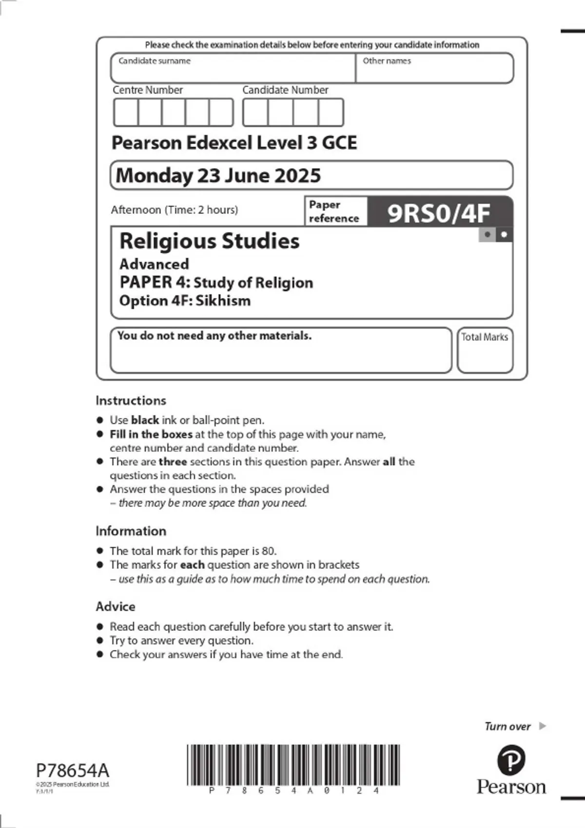 2025 Pearson Edexcel Level 3 GCE 9RS0/4F Religious Studies Advanced PAPER 4: Study of Religion Option 4F: Sikhism QUESTION PAPER + MARK SCHEME