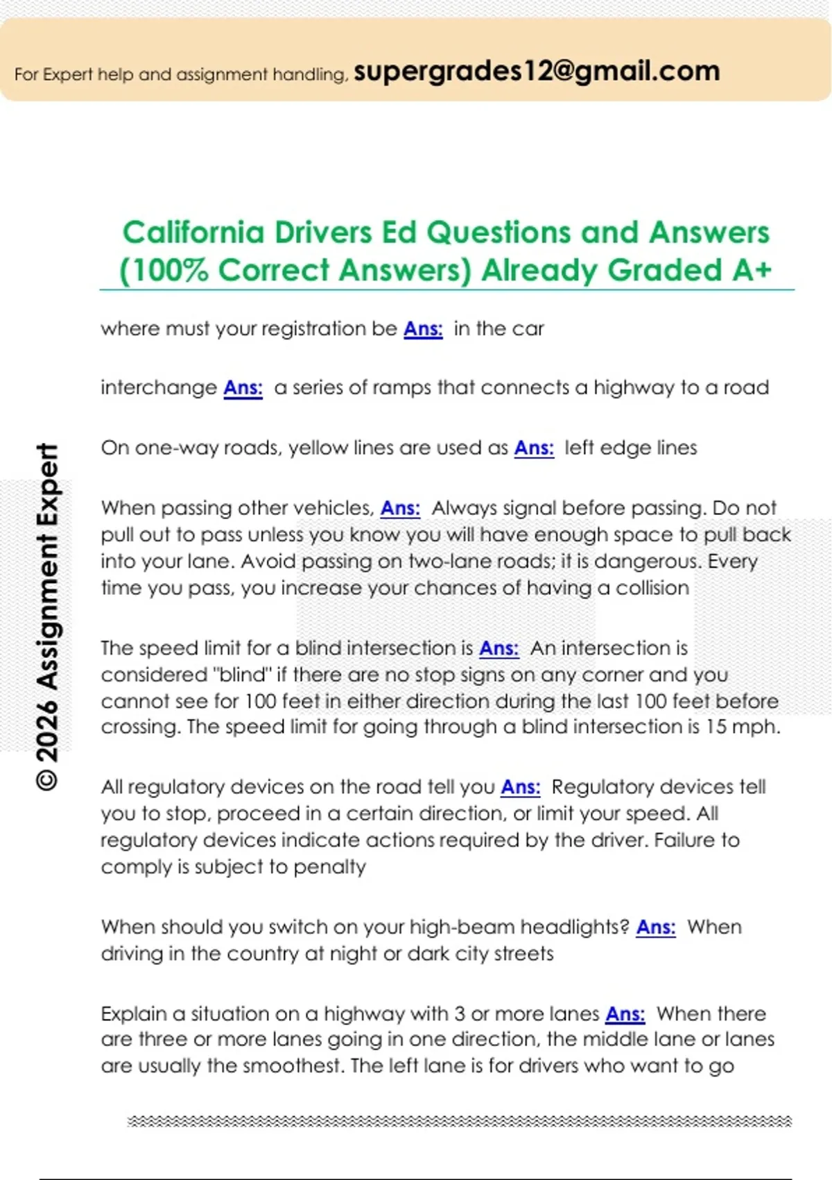 California Drivers Ed Questions and Answers (100% Correct Answers) Already Graded A+