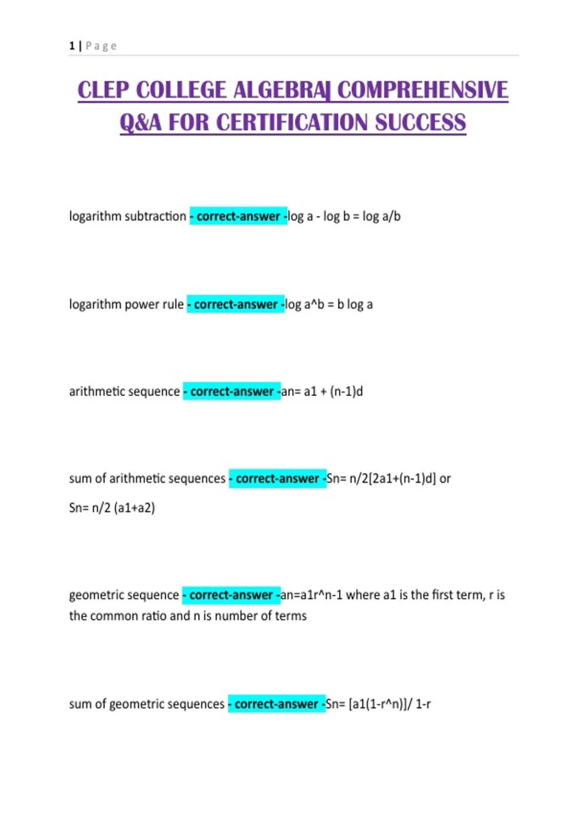 sum of geometric sequences - correct-answer -Sn= [a1(1-r^n)]/ 1-r