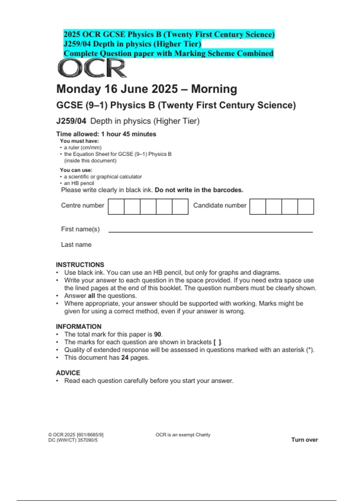 OCR GCSE Physics B J259/04 Higher June 2025 | QP & Mark Scheme