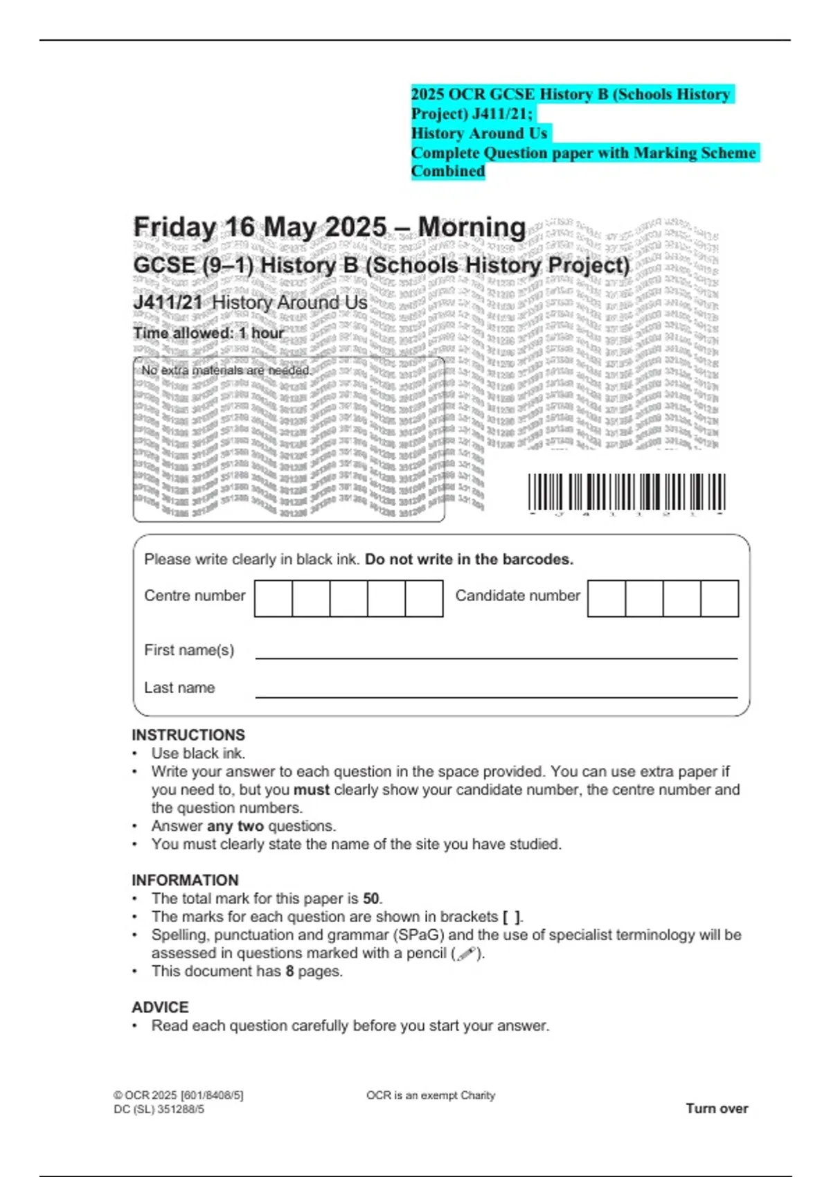 OCR GCSE (9–1) History B J411/21 History Around Us May 2025 Morning. Includes the question paper with Exam-Ready Examiner Mark Scheme for focused GCSE revision.