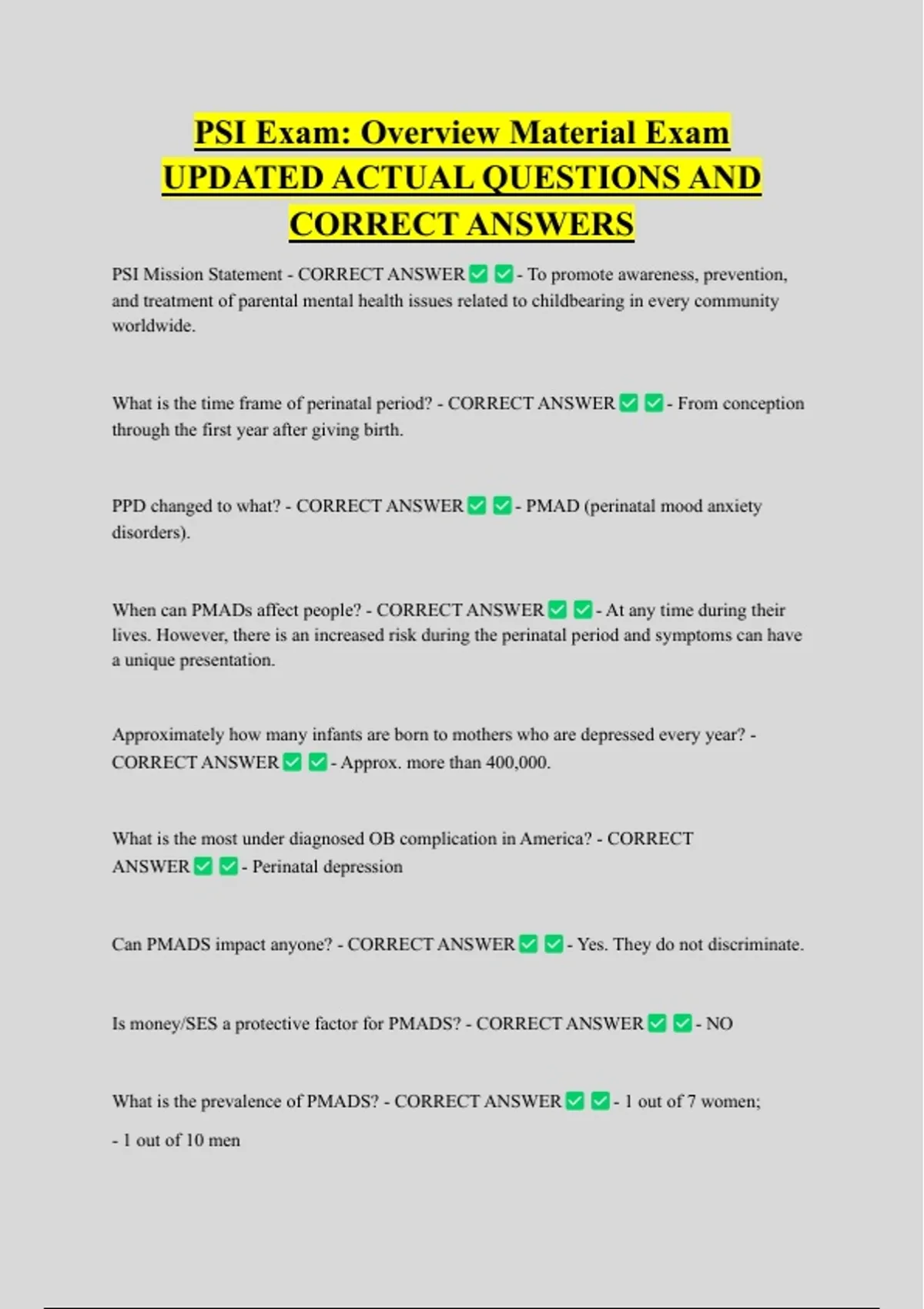 PSI Exam: Overview Material Exam UPDATED ACTUAL QUESTIONS AND CORRECT ANSWERS PSI Mission Statement - CORRECT ANSWER - To promote awareness, prevention, and treatment of parental mental health issues related to childbearing in every community worldwide. What is the time frame of perinatal period? - CORRECT ANSWER through the first year after giving birth. PPD changed to what? - CORRECT ANSWER - From conception - PMAD (perinatal mood anxiety disorders). When can PMADs affect people? - CORRECT ANSWER - At any time during their lives. However, there is an increased risk during the perinatal period and symptoms can have a unique presentation. Approximately how many infants are born to mothers who are depressed every year? - CORRECT ANSWER - Approx. more than 400,000. What is the most under diagnosed OB complication in America? - CORRECT ANSWER - Perinatal depression