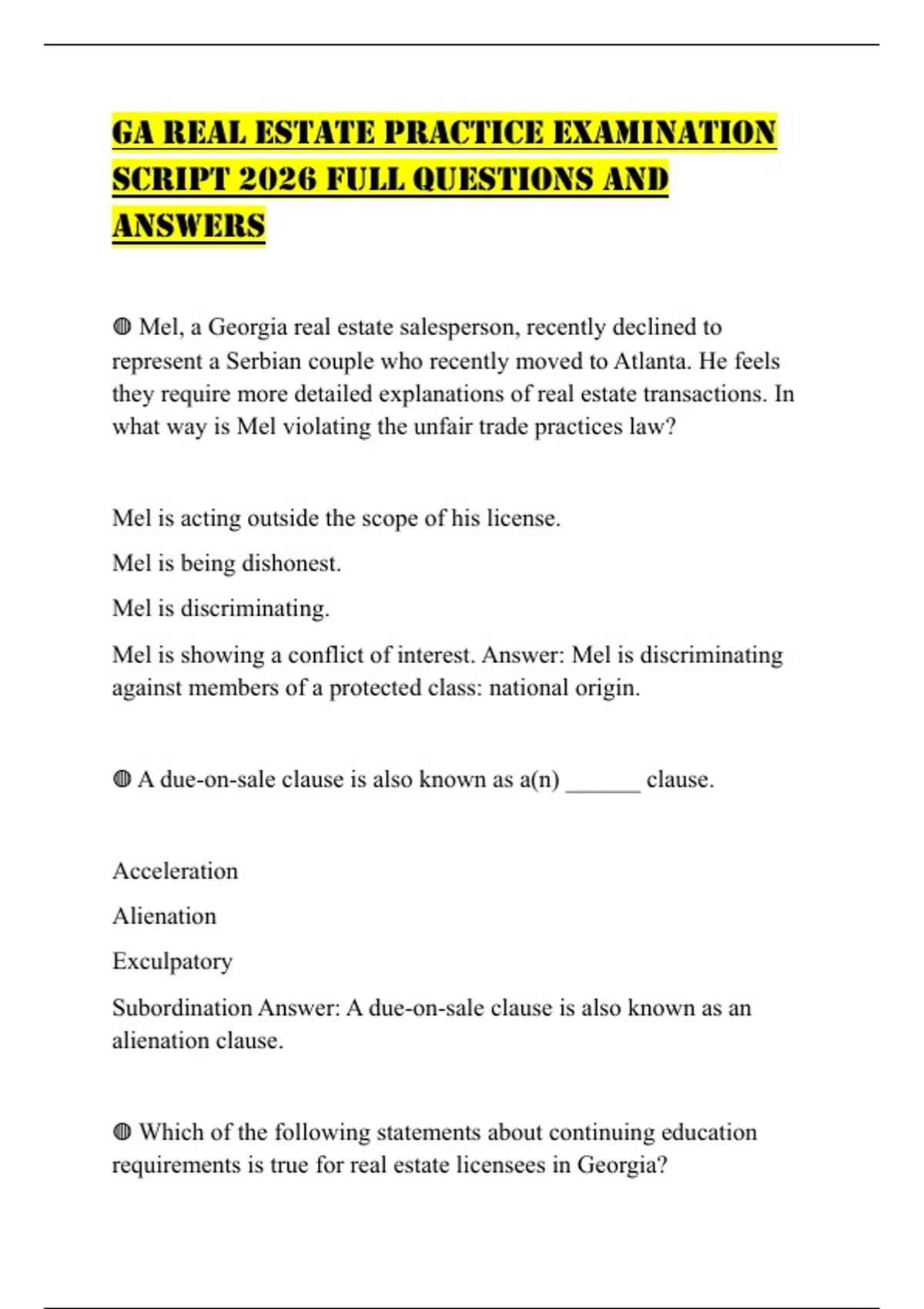 GA REAL ESTATE PRACTICE EXAMINATION SCRIPT 2026 FULL QUESTIONS AND ANSWERS