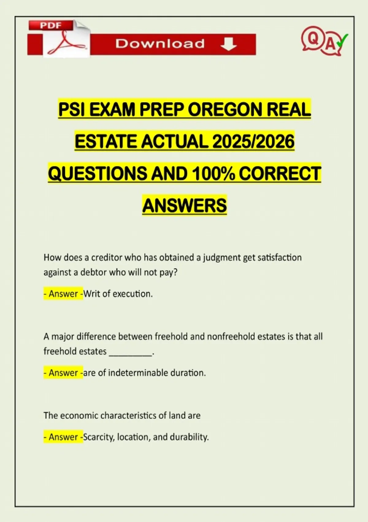 PSI EXAM PREP OREGON REAL ESTATE ACTUAL 2025/2026 QUESTIONS AND 100% CORRECT ANSWERS How does a creditor who has obtained a judgment get satisfaction against a debtor who will not pay? - Answer -Writ of execution. A major difference between freehold and nonfreehold estates is that all freehold estates _________. - Answer -are of indeterminable duration. The economic characteristics of land a