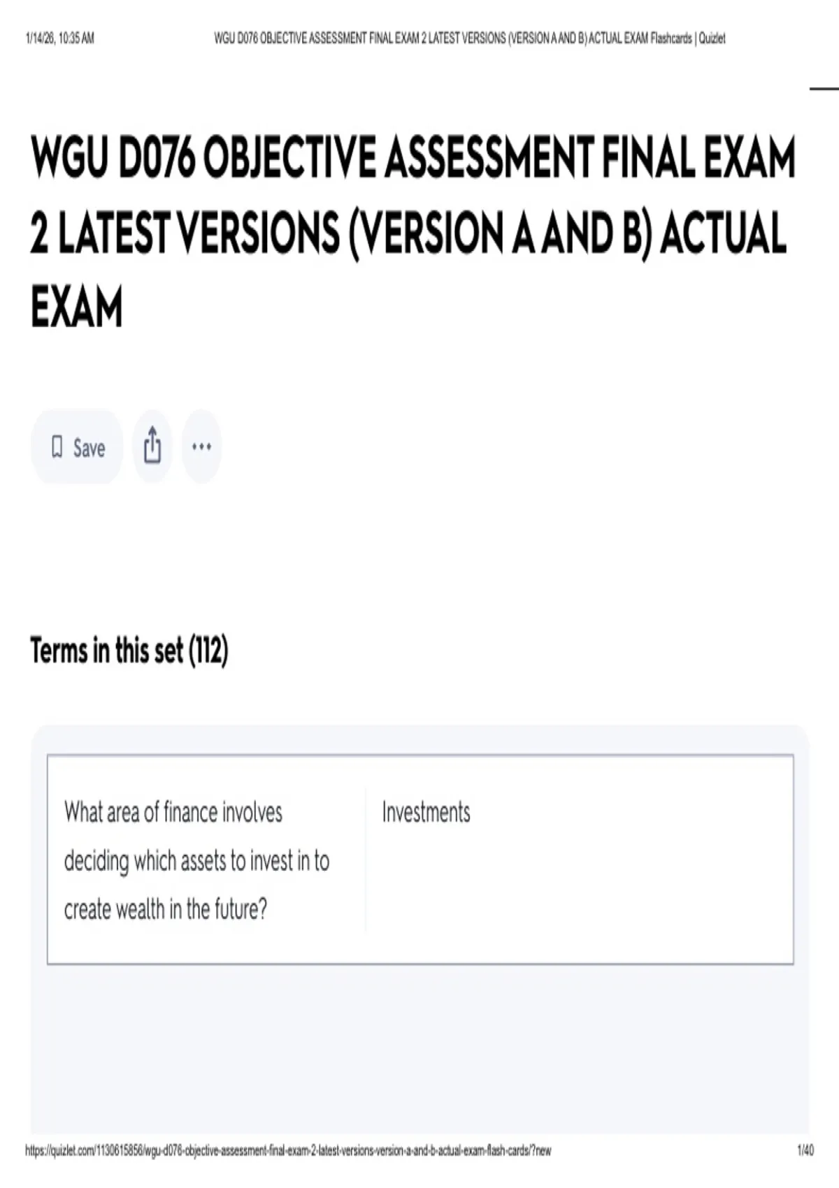 ,1/14/26, 10:35 AM WGU D076 OBJECTIVE ASSESSMENT FINAL EXAM 2 LATEST VERSIONS (VERSION A AND B) ACTUAL EXAM Flashcards | Quizlet
