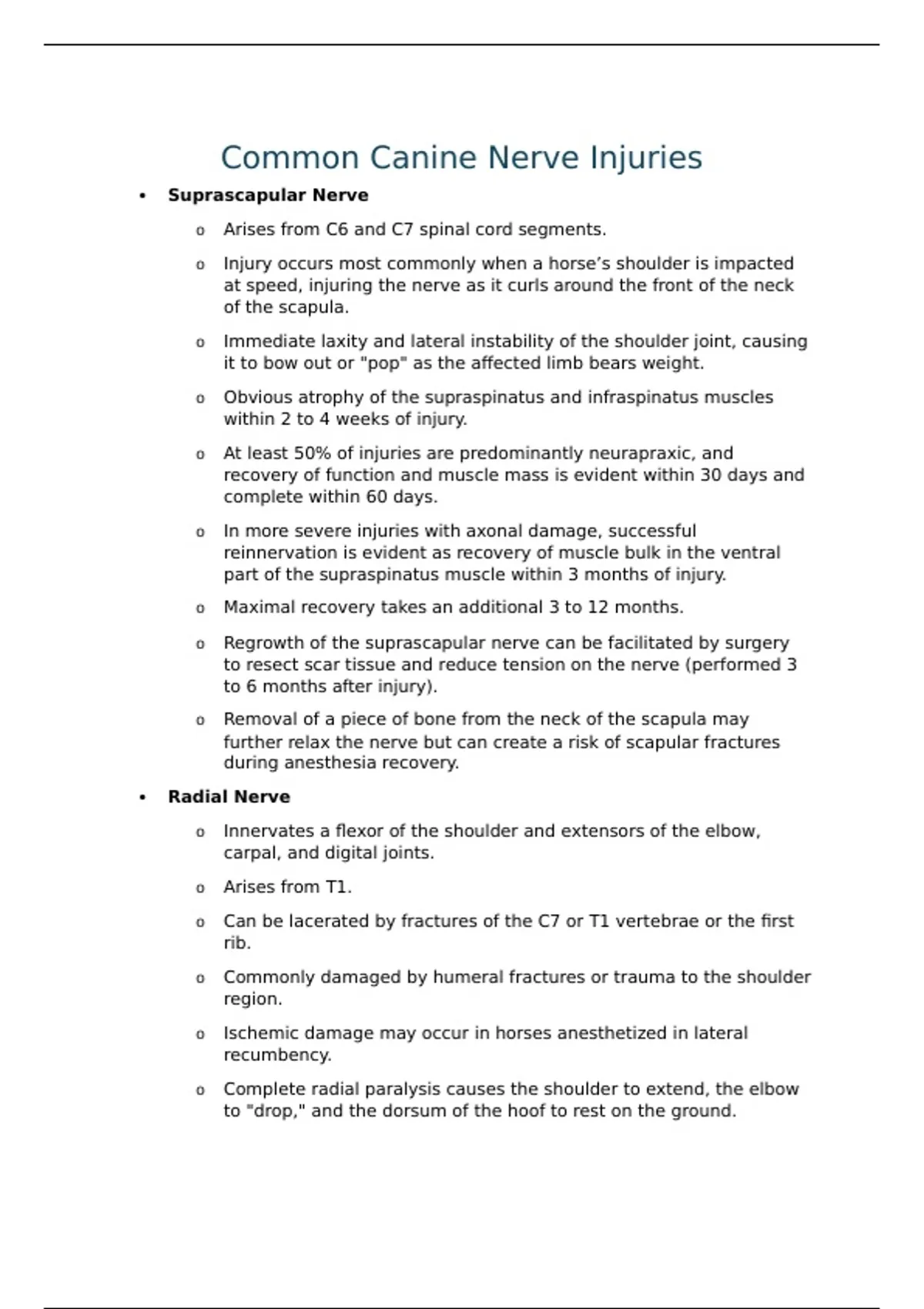 Canine peripheral nerve injuries cause characteristic gait and postural abnormalities. Suprascapular, radial, musculocutaneous, median, ulnar, femoral, sciatic, and peroneal nerves have specific origins, injury mechanisms, and clinical signs. Severity ranges from temporary neurapraxia to axonal damage, with recovery dependent on extent, location, and appropriate management or surgical intervention.