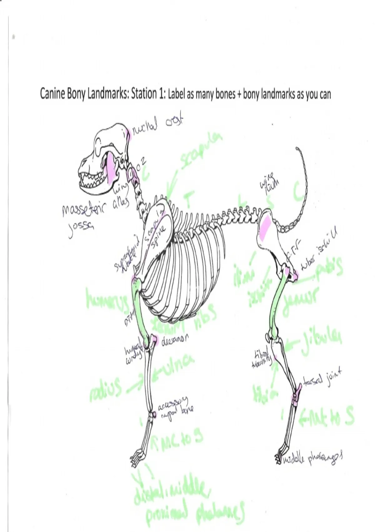 Canine Bony Landmarks Skeleton and labelled - main bones and landmarks needed for anatomy knowledge and palpation skills