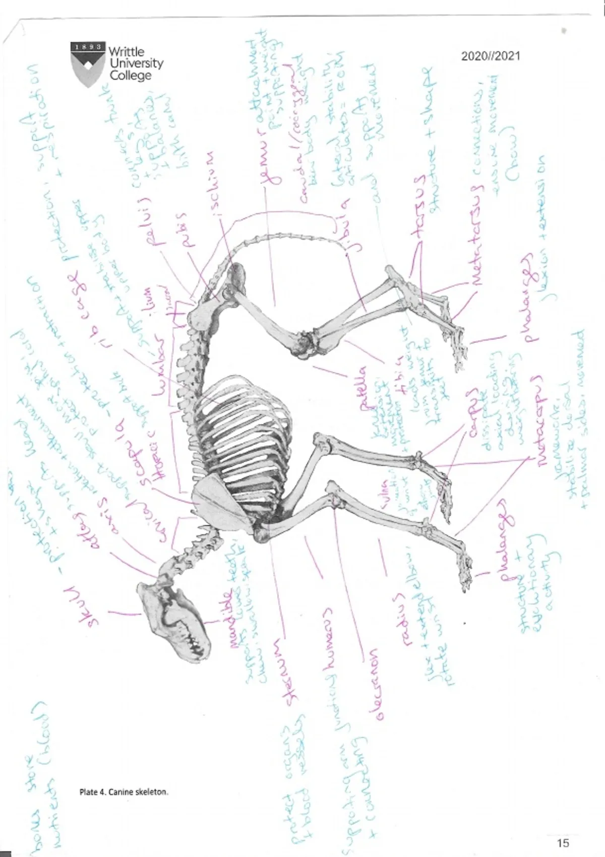 Canine skeleton and landmarks annotated detailed with bones labelled and the main function also annotated.