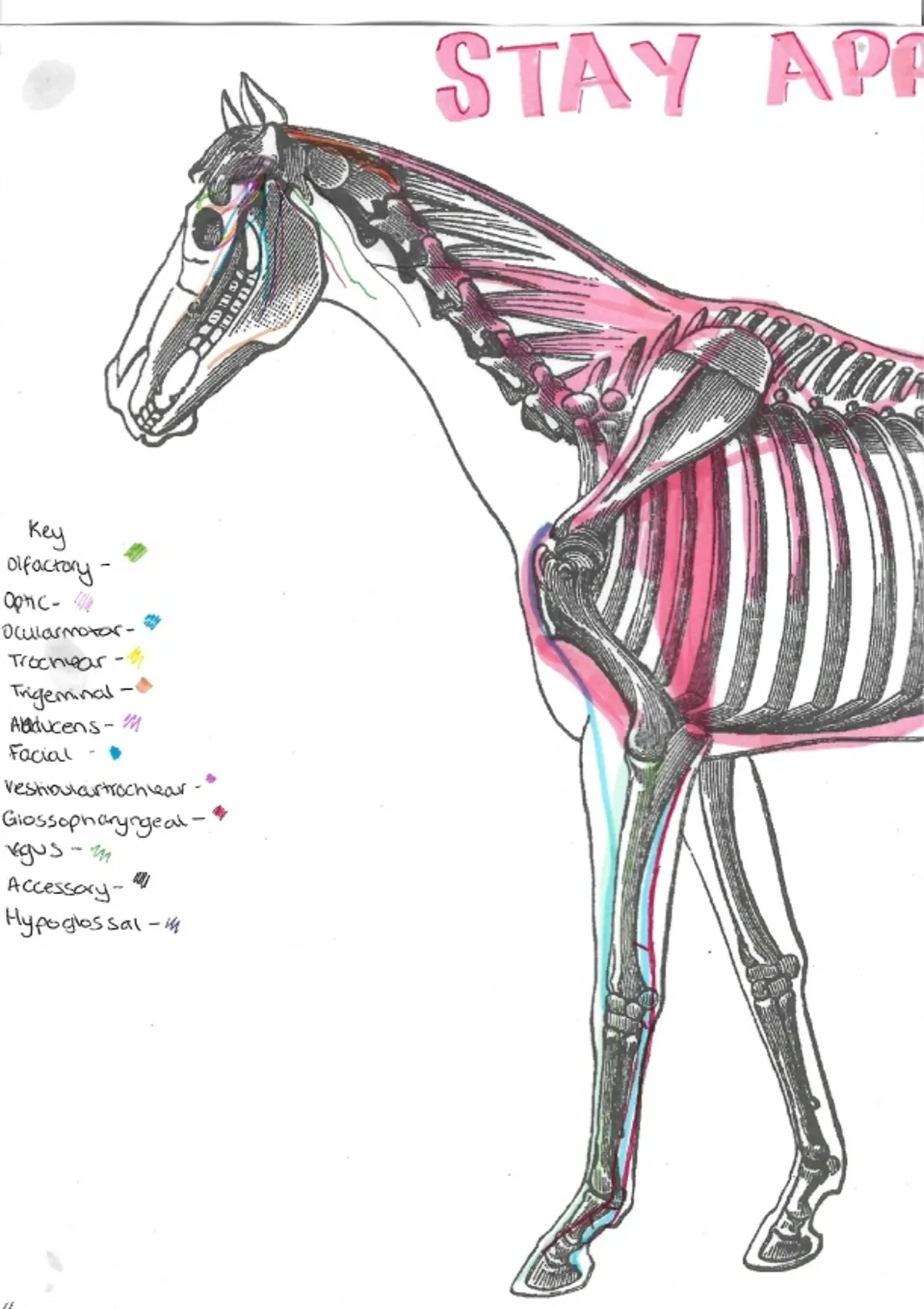 Equine Stay Apparatus A3 diagram and labelled - important muscles involved, on the big equine skeleton, muscles drawn on and labelled