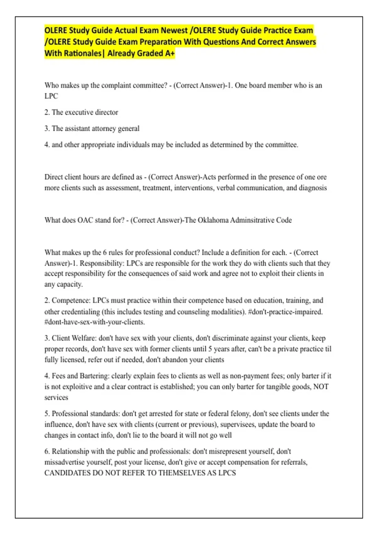 /OLERE Study Guide Exam Preparation With Questions And Correct Answers