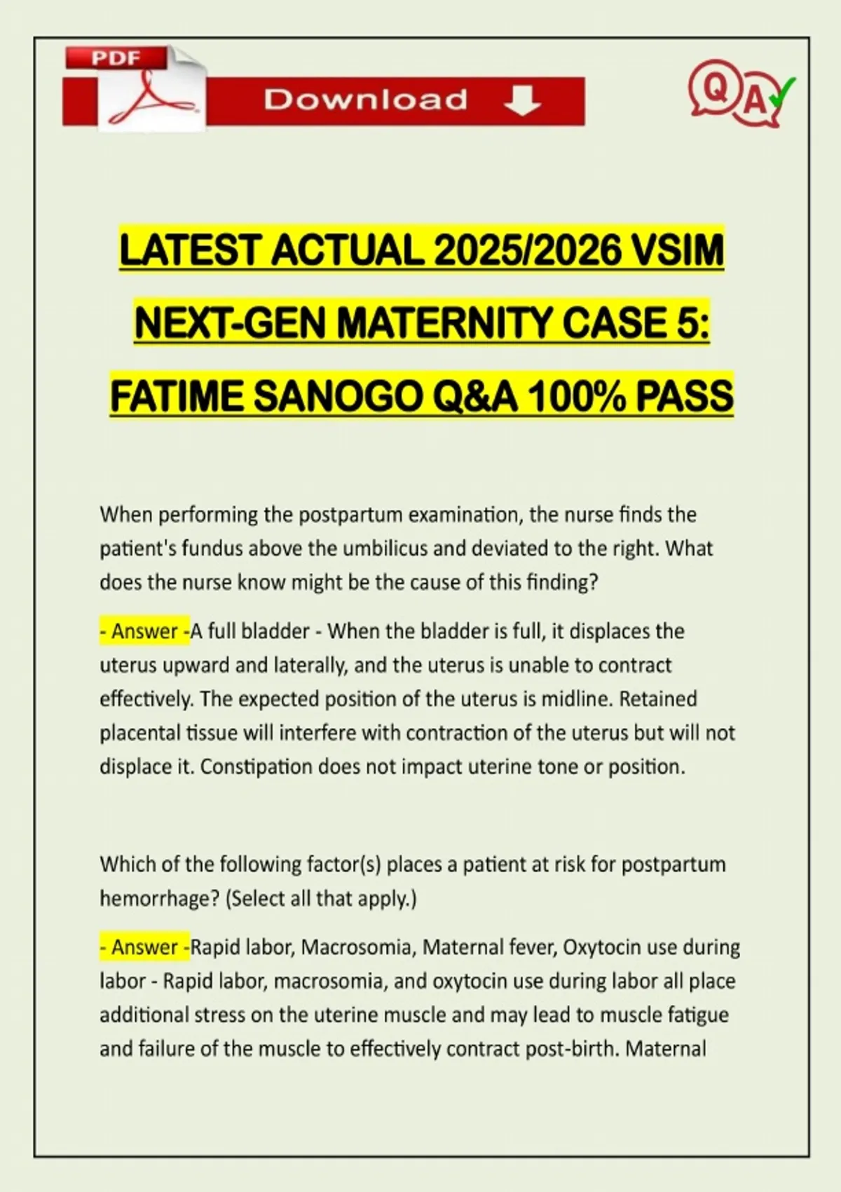 LATEST ACTUAL 2025/2026 VSIM NEXT-GEN MATERNITY CASE 5: FATIME SANOGO Q&A 100% PASS When performing the postpartum examination, the nurse finds the patient's fundus above the umbilicus and deviated to the right. What does the nurse know might be the cause of this finding? - Answer -A full bladder - When the bladder is full, it displaces the uterus upward and laterally, and the uterus is unable to contract effectively. The expected position of the uterus is midline. Retained placental tissue will interfere with contraction of the uterus but will not displace it. Constipation does not impact uterine tone or position. Which of the following factor(s) places a patient at risk for postpartum hemorrhage? (Select all that apply.) - Answer -Rapid labor, Macrosomia, Maternal fever, Oxytocin use during labor - Rapid labor, macrosomia, and oxytocin use during labor all place additional stress on the uterine muscle and may lead to muscle fatigue and failure of the muscle to effectively contract post-birth. MaternalNeed assistance on Online classes, Exams & Assignments? Reach out for instant help!! Full Course Assistance, Plagiarism-free Essay Writing, Research Paper, Dissertation, Discussion Posts, etc…. Confidential & Secure services. Tutors are available for all subjects! Email now at: fever indicating intrauterine infection may also impair the effectiveness of the uterine muscle to contract and control bleeding from the placental site. Preterm birth is not a risk factor for postpartum hemorrhage. While assessing the patient's fundus, the nurse notes that with massage the uterus becomes firm, but then it relaxes again and the bleeding increases. Which of the following causes of excessive bleeding does the nurse suspect? - Answer -Retained tissue- The presence of retained placental
