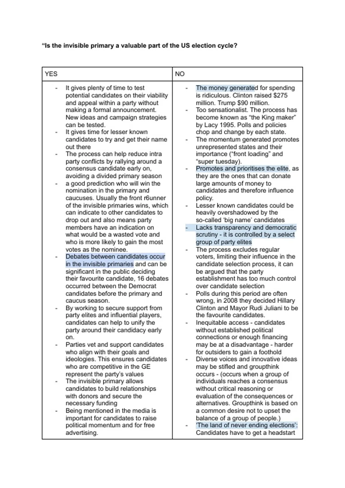 Summary US Politics - “Is the invisible primary a valuable part of the US election cycle?" Detailed Notes/Evidence