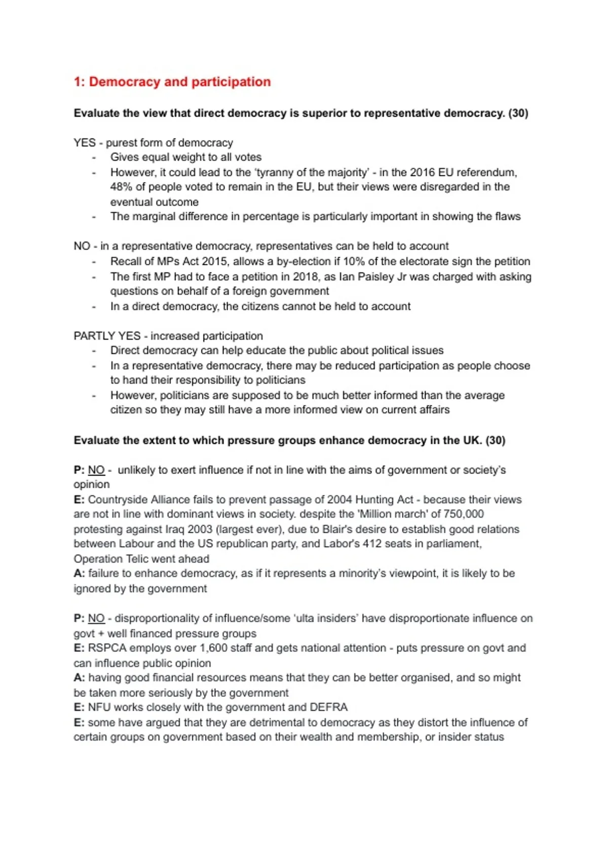 UK Politics Essay Plans - DEMOCRACY AND PARTICIPATION + POLITICAL PARTIES