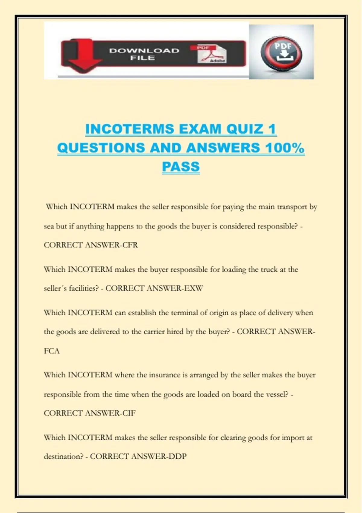 INCOTERMS EXAM QUIZ 1 QUESTIONS AND ANSWERS 100% PASS