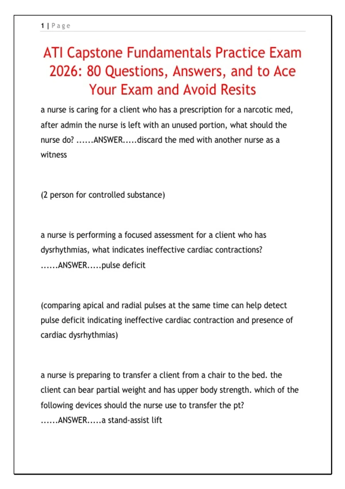 Prepare for the ATI Capstone Fundamentals exam with this 2026 practice test containing 80 questions and verified answers. Covers essential nursing fundamentals: medication safety, assessment skills, patient transfers, infection control, nutrition, developmental stages, legal/ethical issues, wound care, patient education, and more. Ideal for nursing students reviewing for the ATI Capstone or Fundamentals exit exam. Each answer includes rationale to reinforce key concepts and help you ace your exam on the first attempt