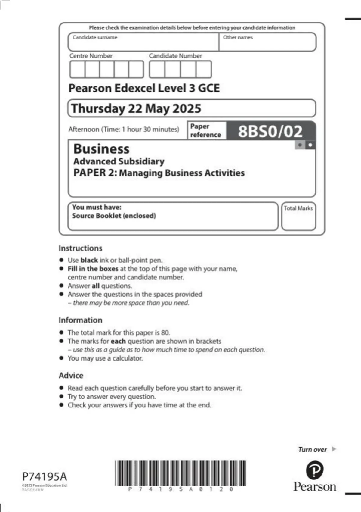Pearson Edexcel GCE AS Level in Business (8BSO) Paper 02 Managing Business Activities June 2025
