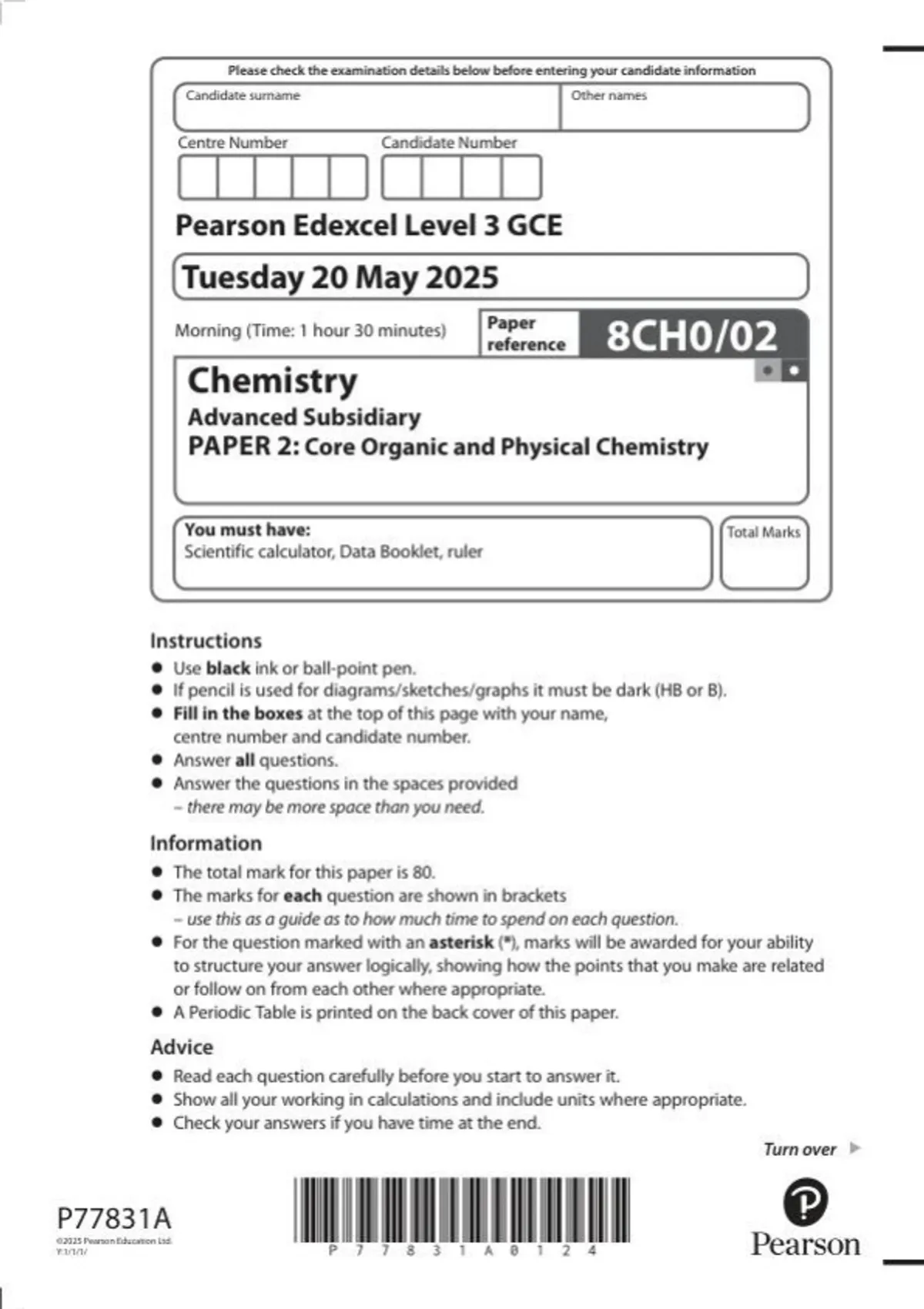 Pearson Edexcel Level GCE Advance Subsidiary In Chemistry (8CHO) Paper 02: Core Organic and Physical Chemistry June 2025