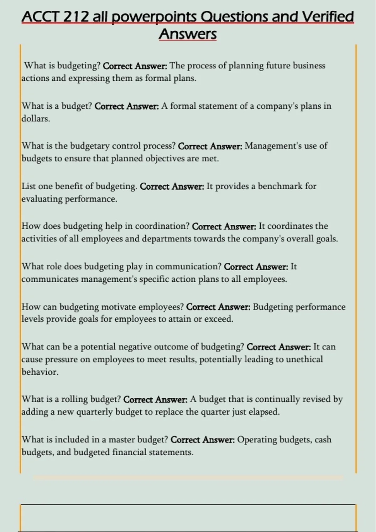 What is a rolling budget? Correct Answer: A budget that is continually revised by