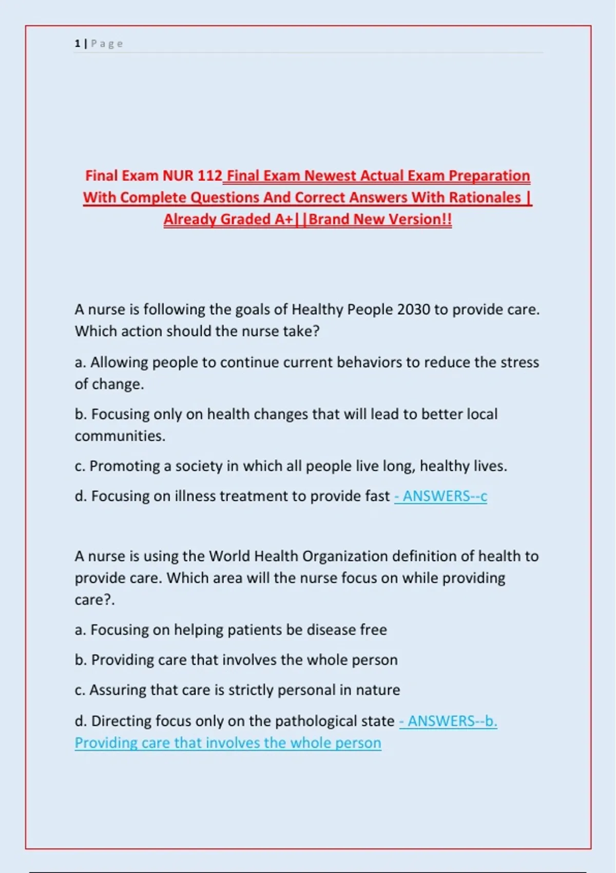 Unlock your nursing success with this comprehensive final exam guide for NUR 112! Featuring real exam questions, correct answers, and clear rationales, this guide covers patient safety, infection control, ethics, clinical skills, and more. Ideal for nursing students preparing for finals, NCLEX review, or clinical rotations—ensure you pass with flying colors!