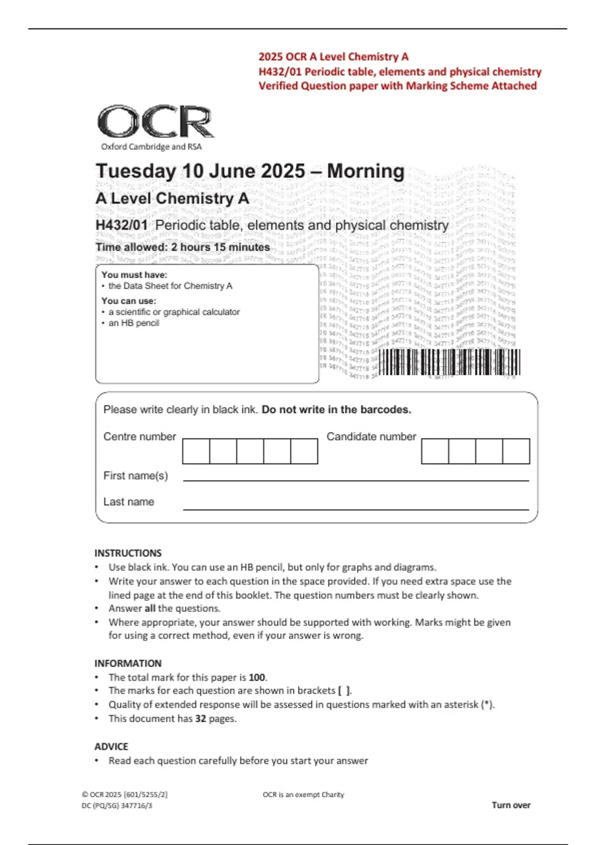 2025 OCR A Level Chemistry A H432/01 Periodic Table, Elements and Physical Chemistry | Question Paper with Exam-Ready Examiner Mark Scheme | All Chapters Latest 2026/2027 Edition | Verified Answers