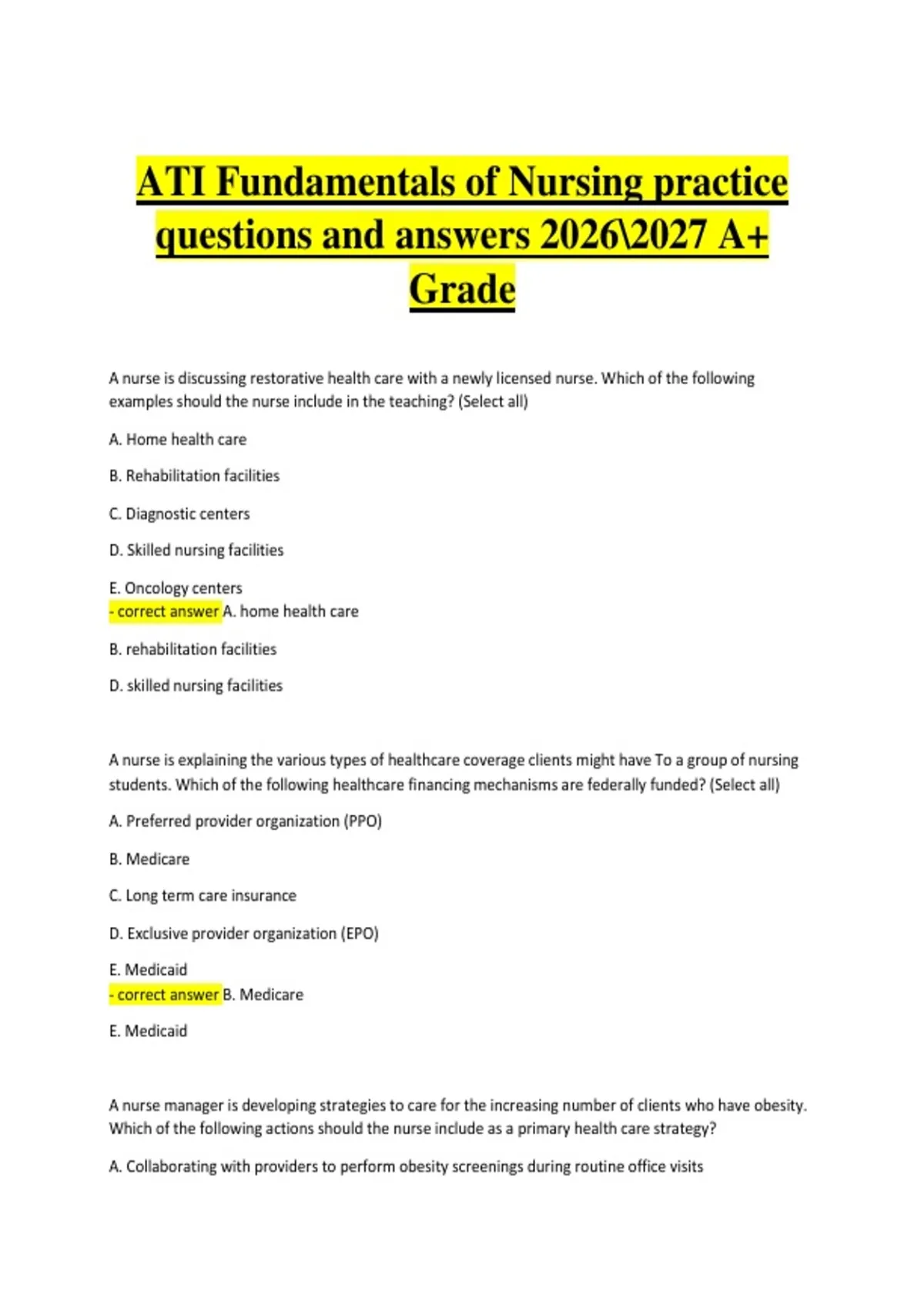 The ATI Fundamentals of Nursing Exam is part of the Assessment Technologies Institute (ATI) nursing preparation series. It evaluates foundational nursing knowledge required for safe and effective practice. The 2026/2027 verified study sets provide A+ graded questions and answers aligned with NCLEX-RN test plans.
